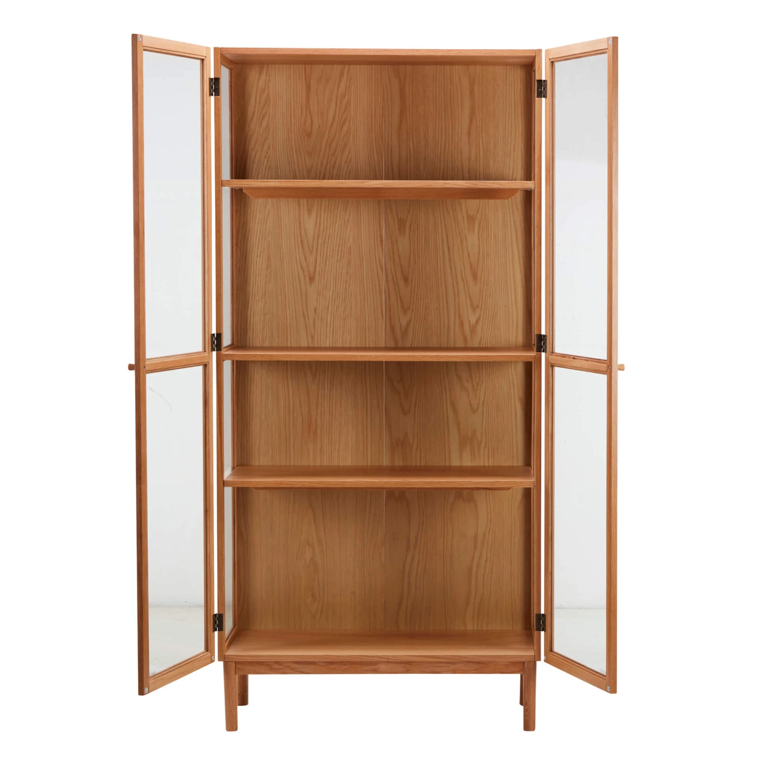 A stunning tall display that is inspired by Nordic Minimalism. This three sided glass display unit allows you to showcase your valuables no matter where this piece is placed in your room. The woods warm tone harmonizes with the organic shapes and soft edges, building on that Nordic feel. With two small handles at the front of the unit, it allows you to easily access the four spacious shelves.