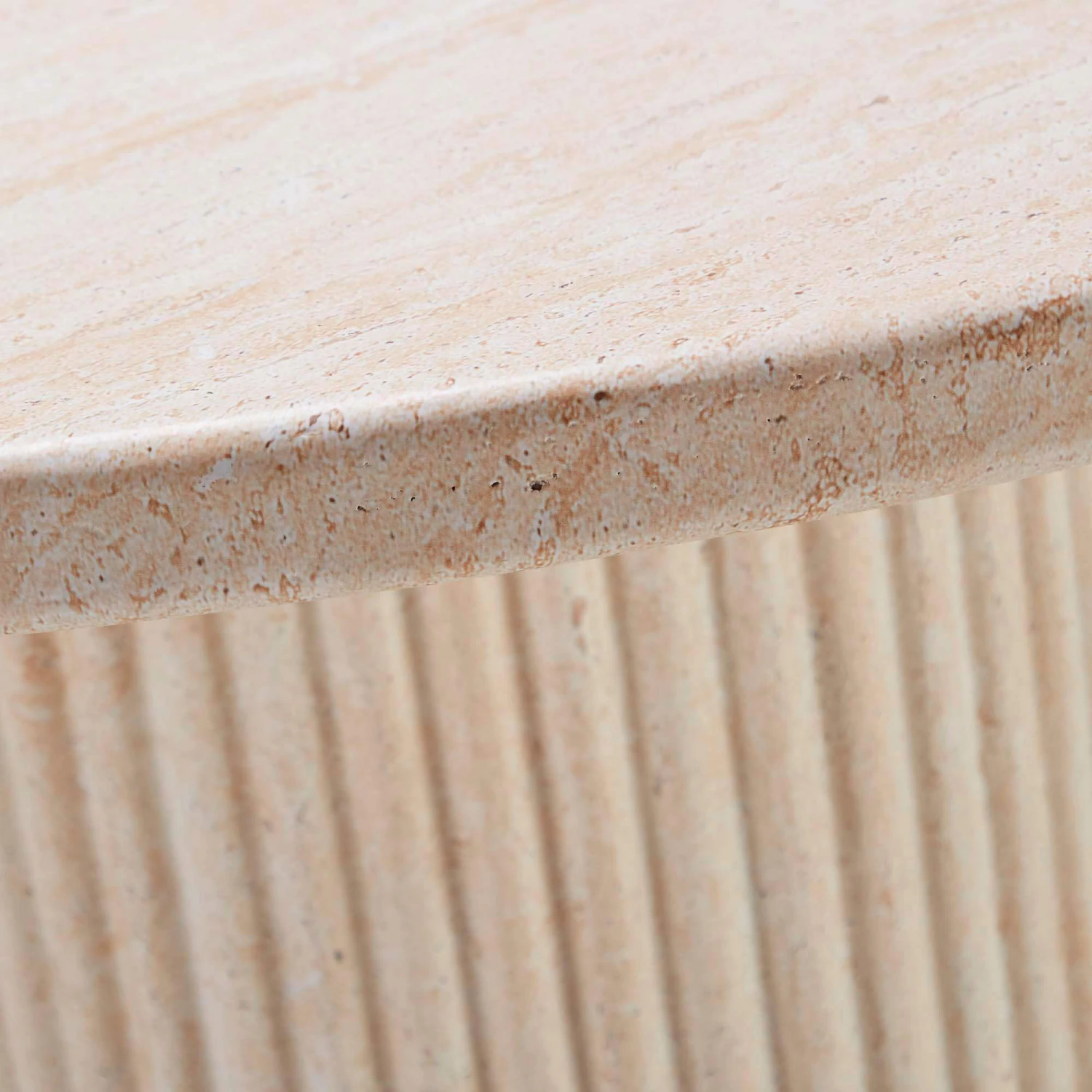 A wonderful 120cm concrete dining table with a bold centrepiece that has a wrap-around reeded design. The reeded effect that wraps around the middle has a stunning travertine effect finish that adds visual intrigue to the piece. With a soft, rounded table top it provides the table with a polished finish. The faux travertine coating provides the table with a distinct style and also helps create a protective coating.