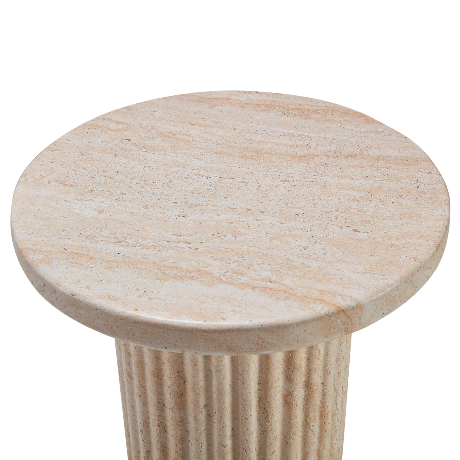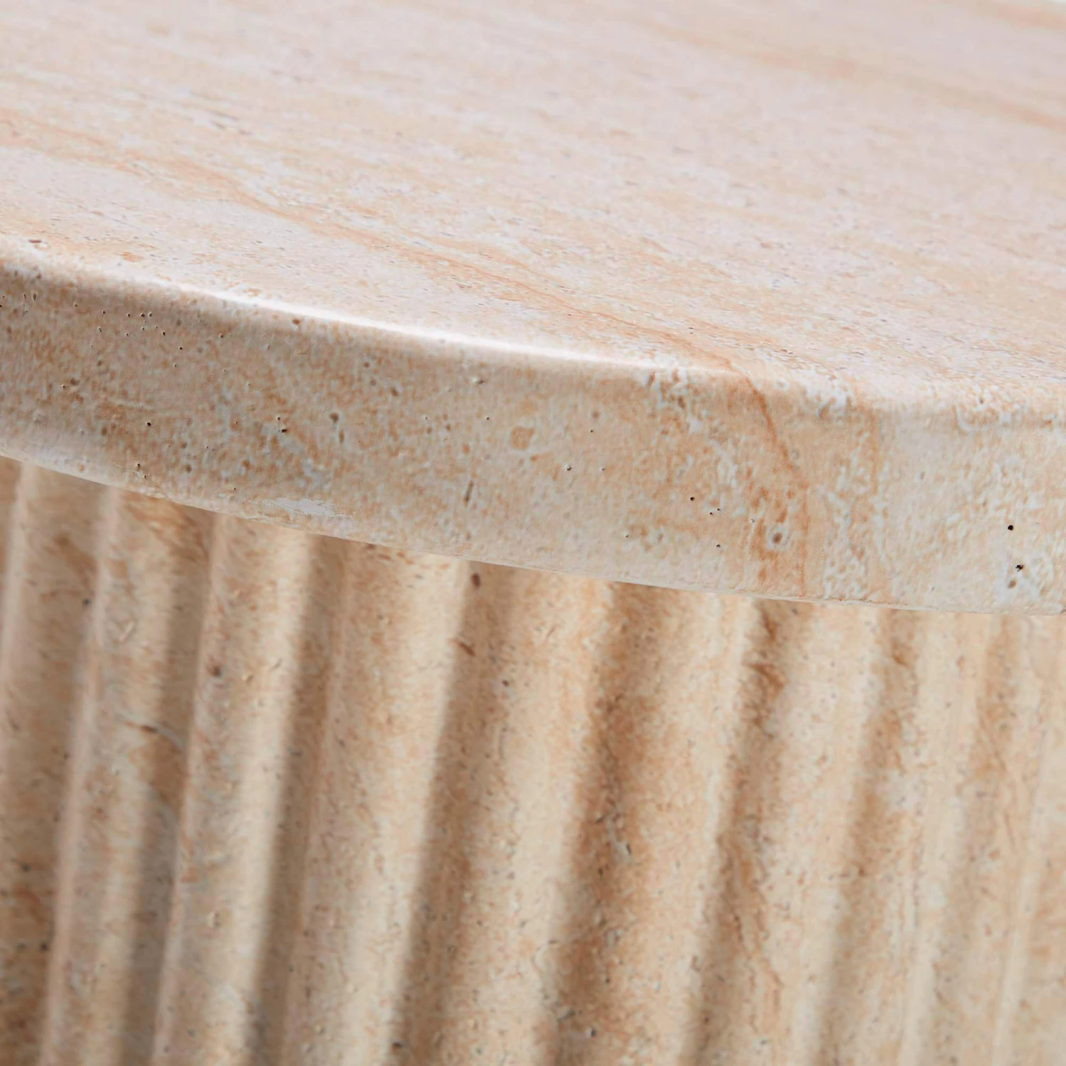 A wonderful concrete side table with a bold column base that has a wrap-around reeded design. The reeded effect that wraps around the middle has a stunning travertine effect finish that adds visual intrigue to the piece. With a soft, complimenting table top. The faux travertine coating provides the table with a distinct style and also helps create a protective coating.