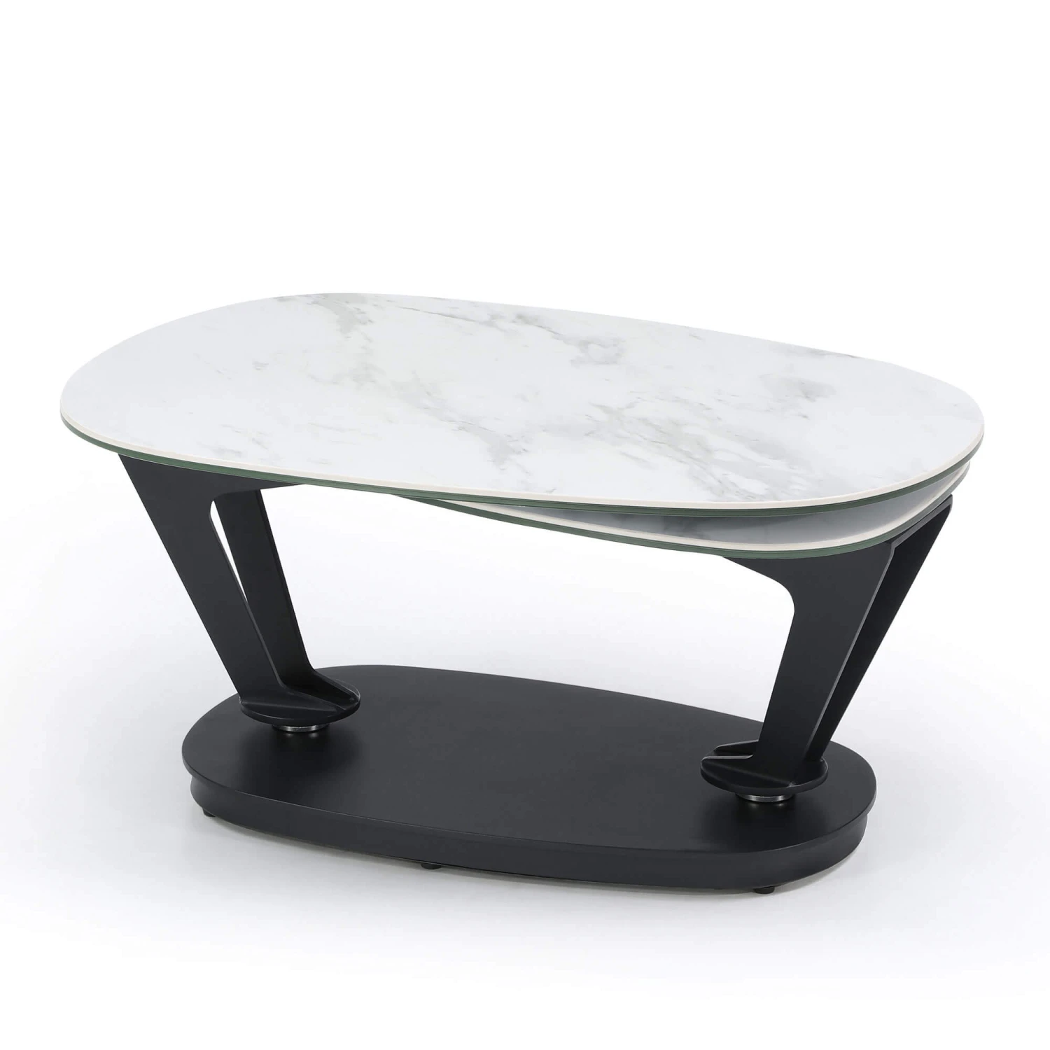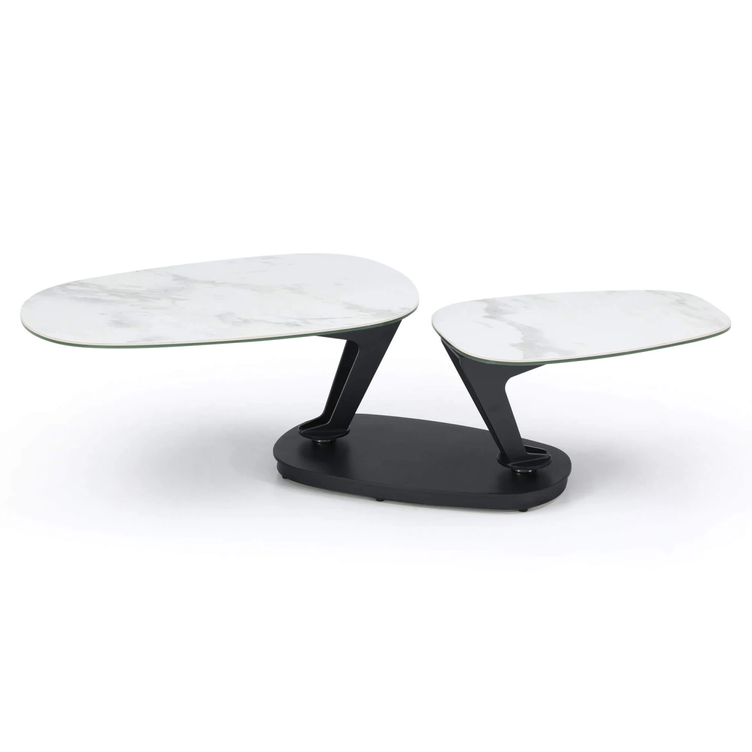 The beautiful Andria coffee table offering versatility that allows you to expand for more surface space or close to make smaller when not in use. Designed with polished marble effect ceramic bonded to clear glass. Aluminium bosses are bonded to the underside of the glass to allow the supports to be bonded to the powder coated steel frame. Due to the weight of the base take care when lifting, do not lift from the base.