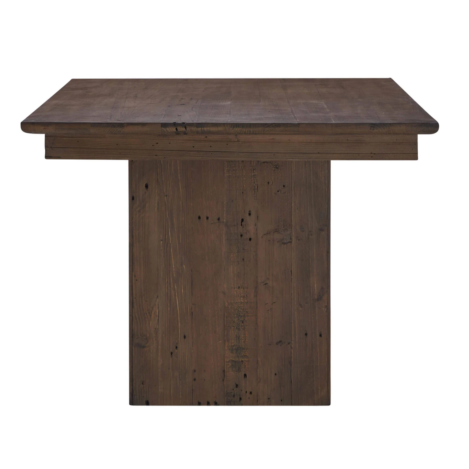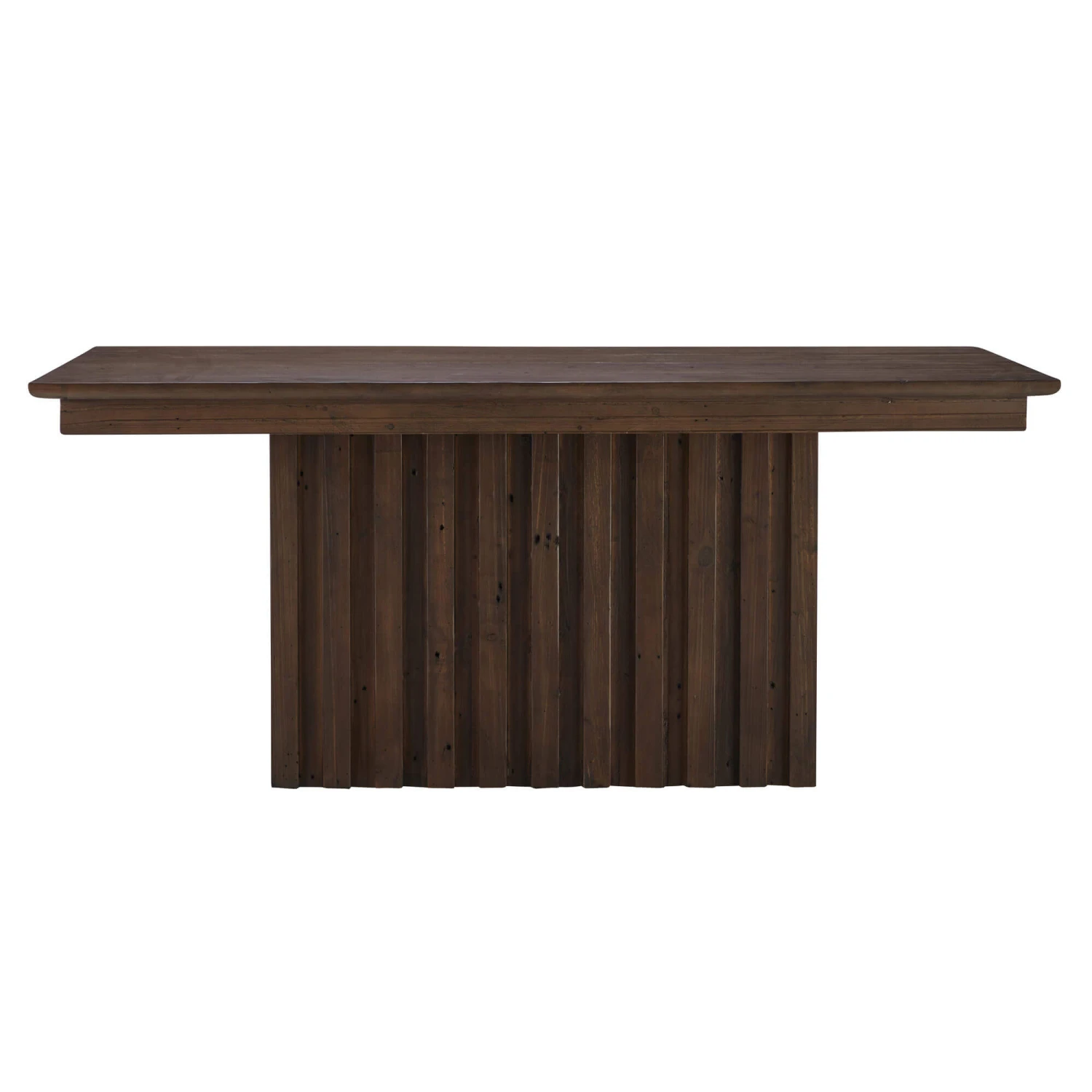 A large 210cm reclaimed wood dining table in a rich brown that combines rustic charm with modern design, making it an ideal centrepiece for any dining room. Crafted from natural wood, the rectangular fixed table measures 210cm and features a beautifully panelled design that showcases the unique wood grain, highlighting the character and warmth inherent in renewed wood tables. The dark wood tones lend a sophisticated depth, whilst the solid construction ensures durability and timeless appeal. The table’s distinctive reeded base adds a subtle yet striking texture, elevating the overall aesthetic.