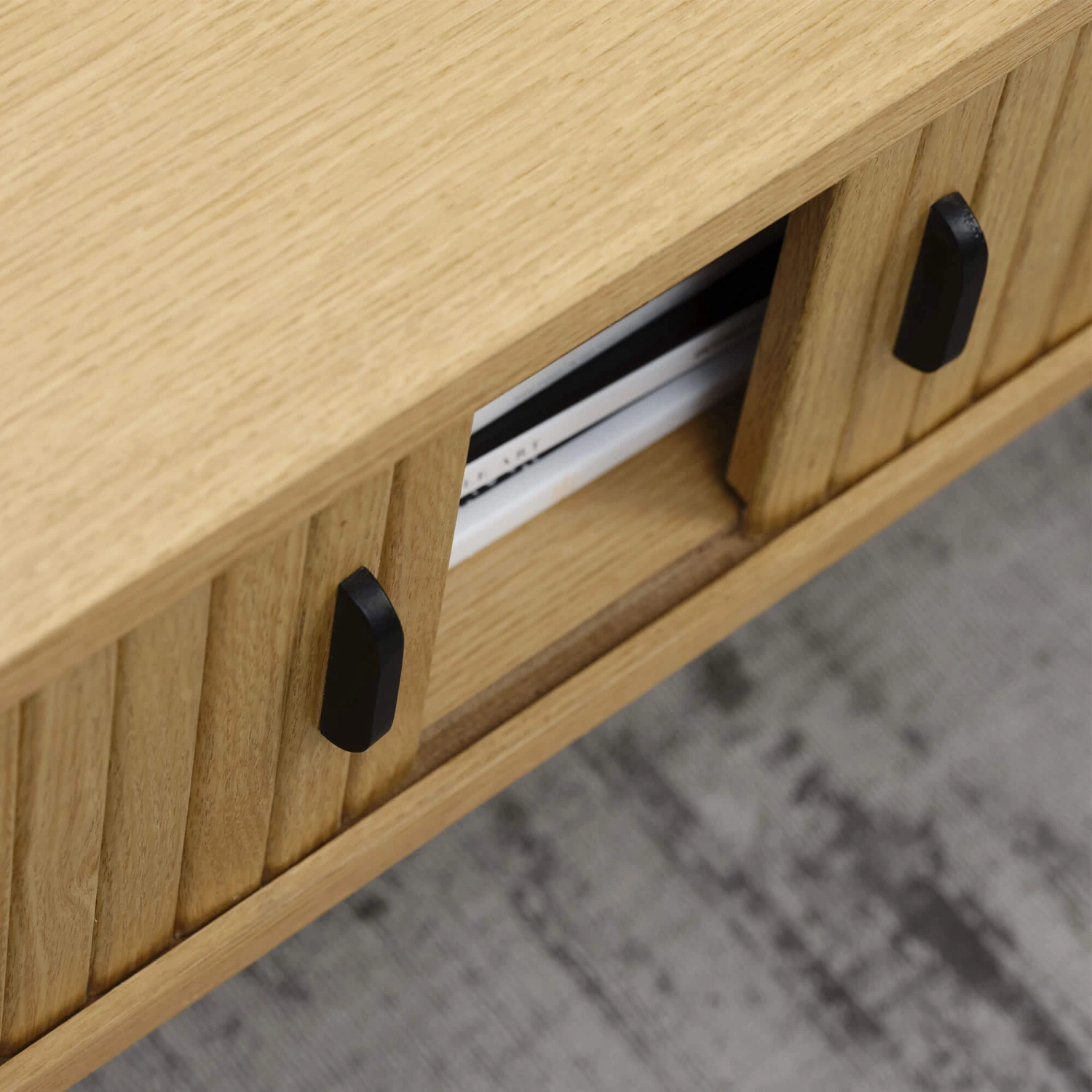 A stylish and striking coffee table to create a beautiful centrepiece in your home, beautifully crafted with handy storage underneath to keep your living space tidy. Complete with a vertical panelling across the outside for a practical yet stylish contemporary look. The weighted base ensures the table remains stable will sleek black legs and black handle hardware.