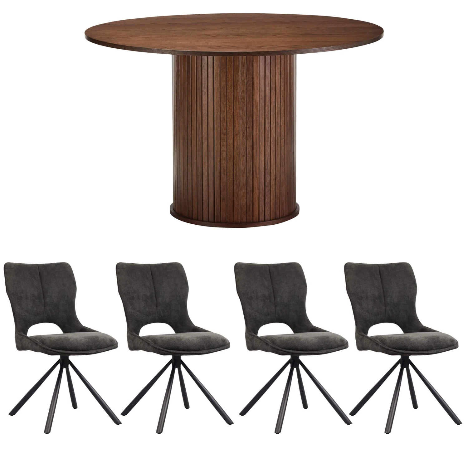 Made from a smoked oak veneer in a rich, warm brown tone, with a textural appearance echoing the grain and raw beauty of natural wood, the Annika has a certain charm. Signature slatted panelling on the solid, column-like structure of the central cylindrical pedestal on this piece further elevates its rustic appeal, whilst lending this table its unmistakable character and attractive, architectural-like quality.