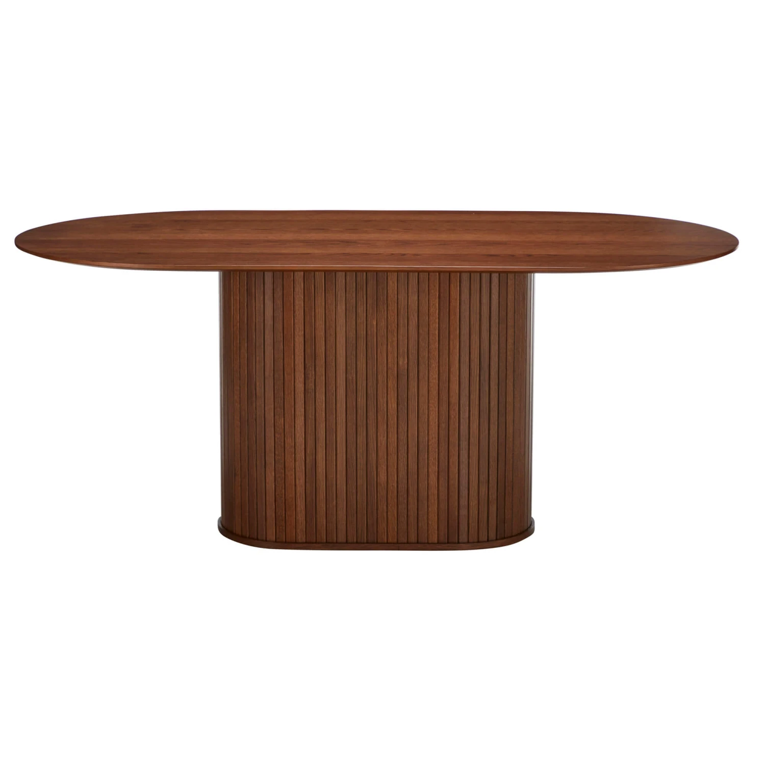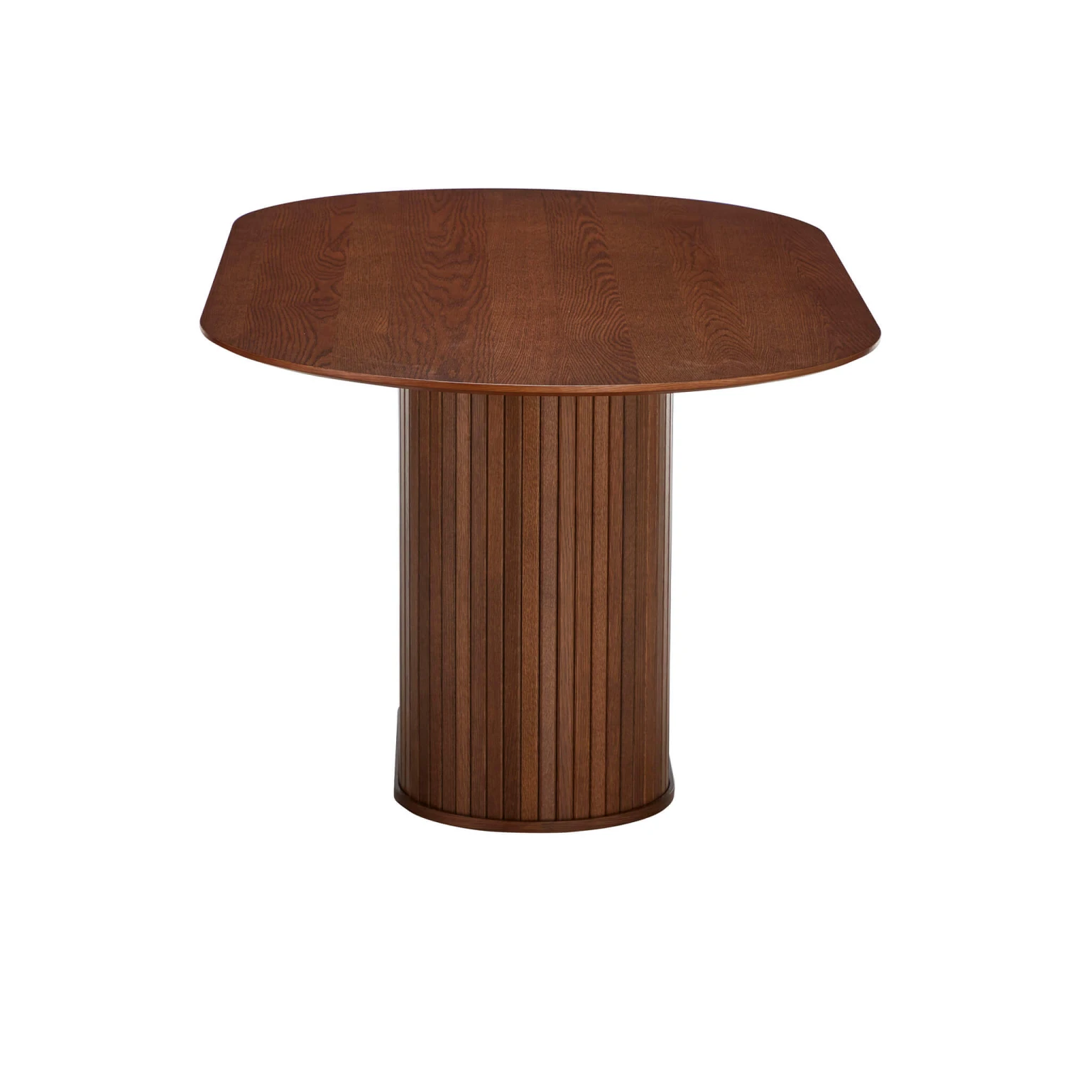 Made from a smoked oak veneer in a rich, warm brown tone, with a textural appearance echoing the grain and raw beauty of natural wood, the Annika has a certain charm. Signature slatted panelling on the solid, column-like structure of the central cylindrical pedestal on this piece further elevates its rustic appeal, whilst lending this table its unmistakable character and attractive, architectural-like quality.