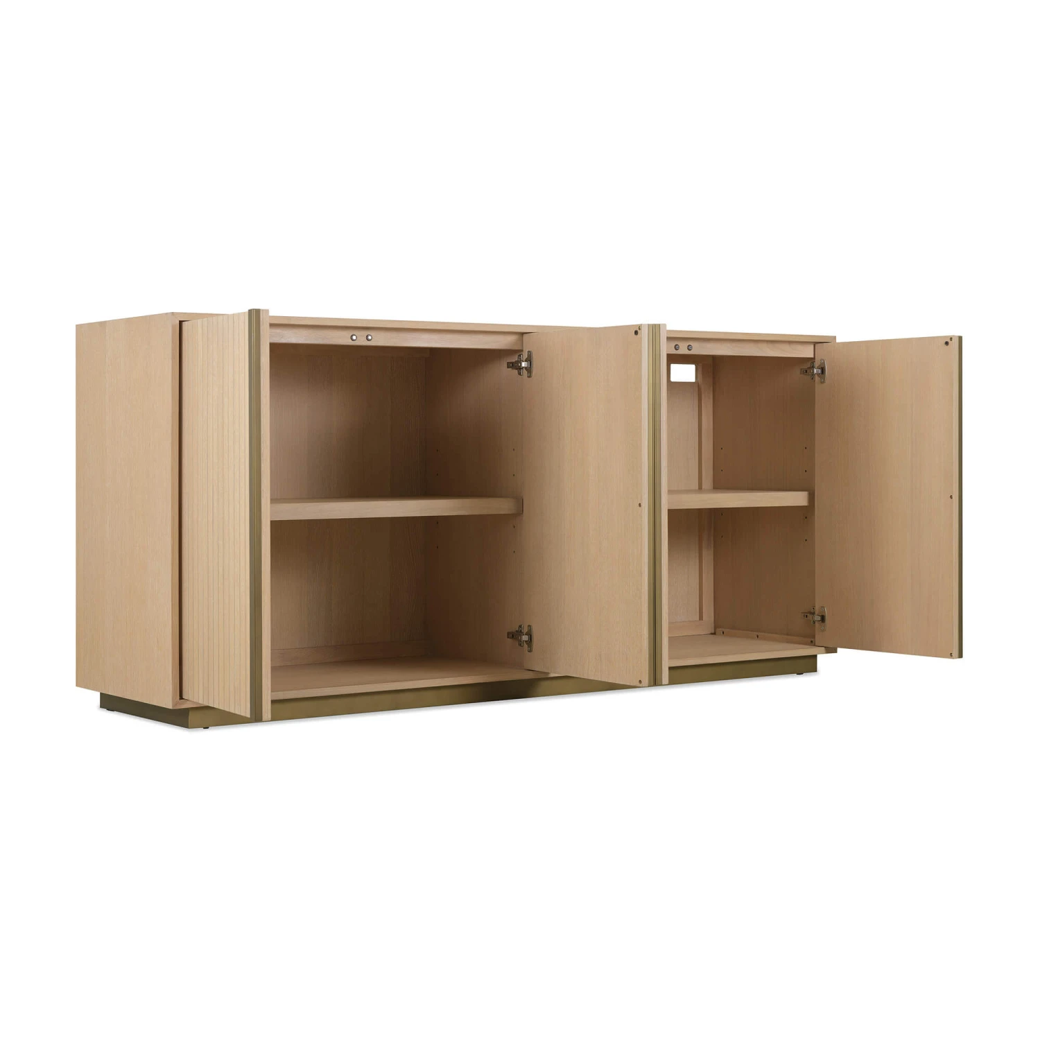 Crowning the reeded doors are striking, full-height bronze coloured handles that run from top to bottom of each door, offering a subtle contrast to the light oak. The sideboard is elevated by a sleek bronze coloured base, which lifts the unit and completes the modern aesthetic.
