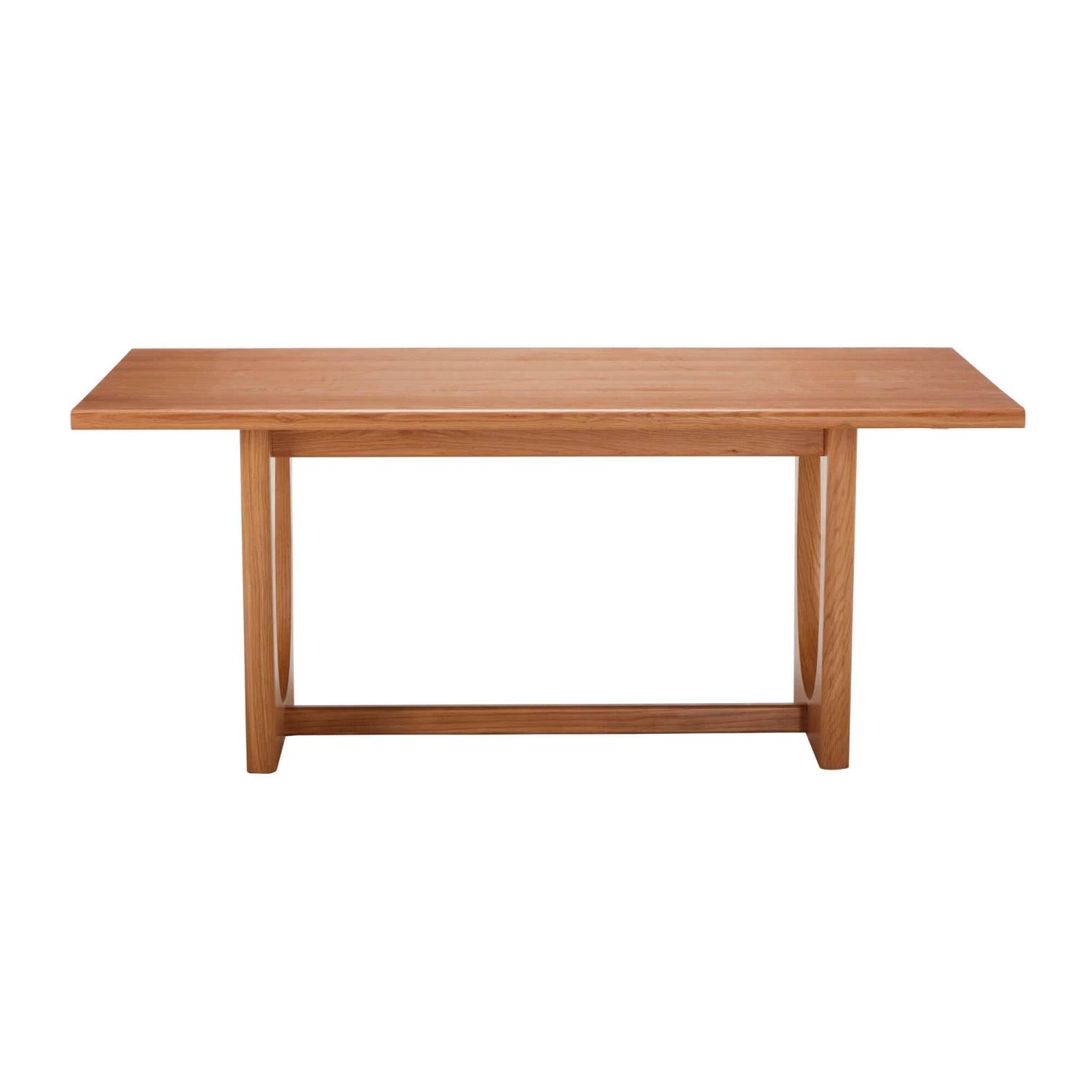 Introducing the Arden 180cm Natural Oak Dining Table, a sophisticated solid oak dining table. Meticulously crafted with a classic rectangular top, this modern oak dining table features extraordinary legs that each mimic an upside-down arch, creating an organic shape that gracefully connects at the base with a wood support featuring a smooth bullnose profile. The base and legs form a fluid, sculptural silhouette that transforms the contemporary oak dining table into an artistic statement. Carefully aligned wood grain and a full bullnose edge enhance the table’s natural beauty, showcasing the rich textures and warm tones of the oak. The organic-shaped base of the individually arched legs provides a gentle, flowing contrast to the table’s clean rectangular top.
