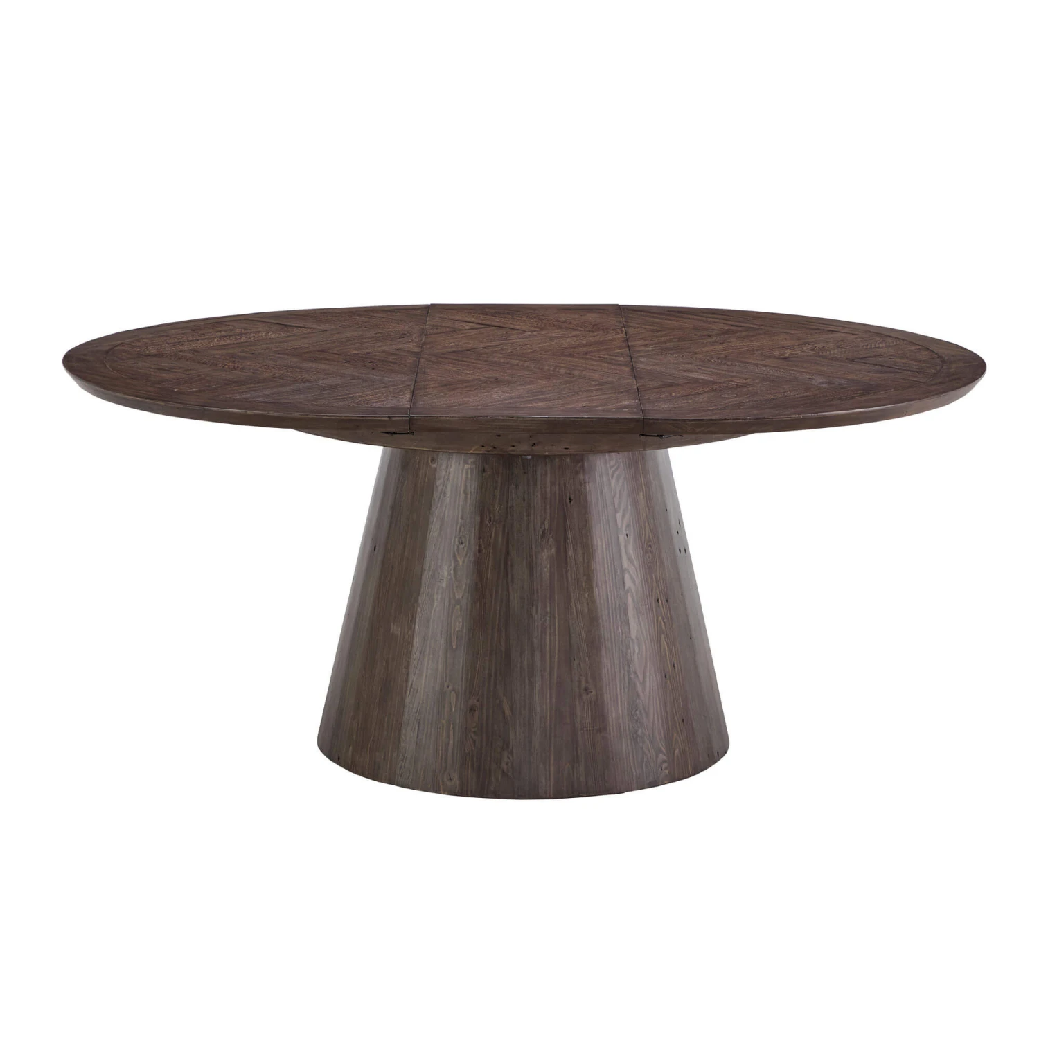 A large dark wood extending dining table featuring a large cylindrical base which broadens at the bottom creating a strong base. On the top is a rounded table top which showcases a herringbone pattern that runs through the top with a soft brown rim that encapsulates the table top. The dark brown wood is seen throughout and highlights the woods natural grain, character and charm.