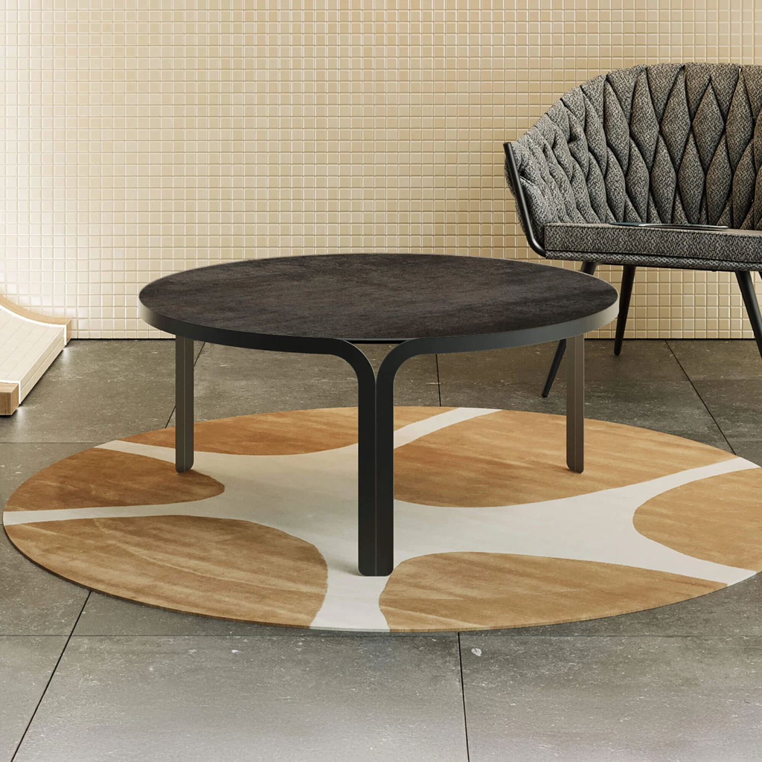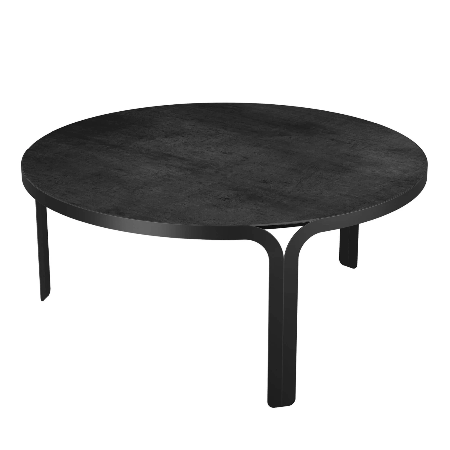 A steel coffee table with the legs that seamlessly blend into a round frame. The tables gentle curves compliment the textured table top and creates a visually intriguing coffee table. With three sections that blend together it makes a uniformed look, which is ideal in contemporary home spaces.