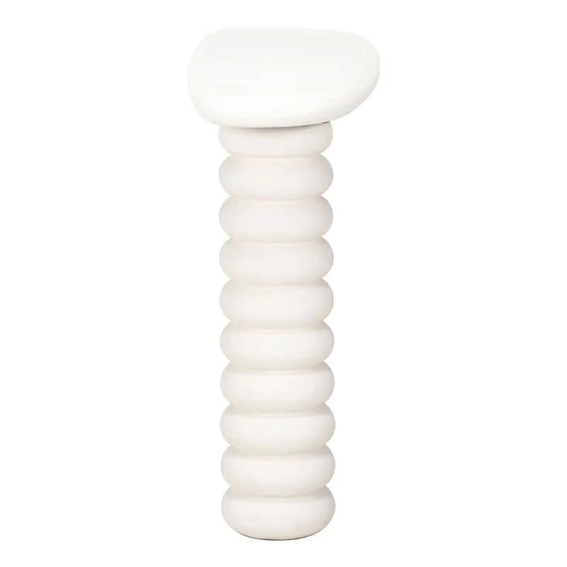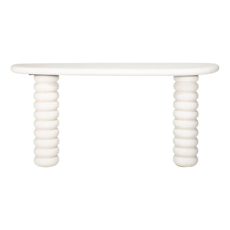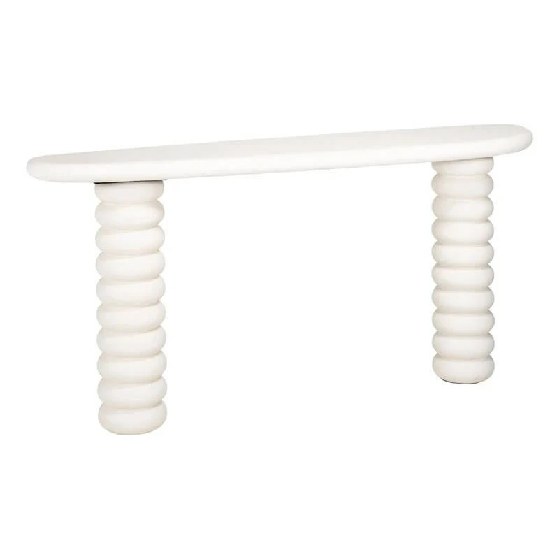 Its distinctive organic silhouette, inspired by the smooth contours of a pebble, creates a sense of natural flow and harmony. Finished in a light-toned white plaster, the console table exudes a fresh, contemporary charm while maintaining a subtle, understated presence. The curved shape not only adds visual interest but also softens the overall look, making it an inviting addition to any living room.