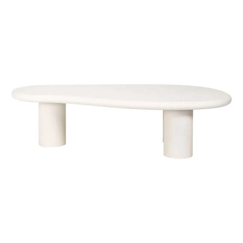 Its distinctive organic silhouette, inspired by the smooth contours of a pebble, creates a sense of natural flow and harmony. Finished in a light-toned white plaster, the long coffee table exudes a fresh, contemporary charm while maintaining a subtle, understated presence. The curved shape not only adds visual interest but also softens the overall look, making it an inviting addition to any living room.