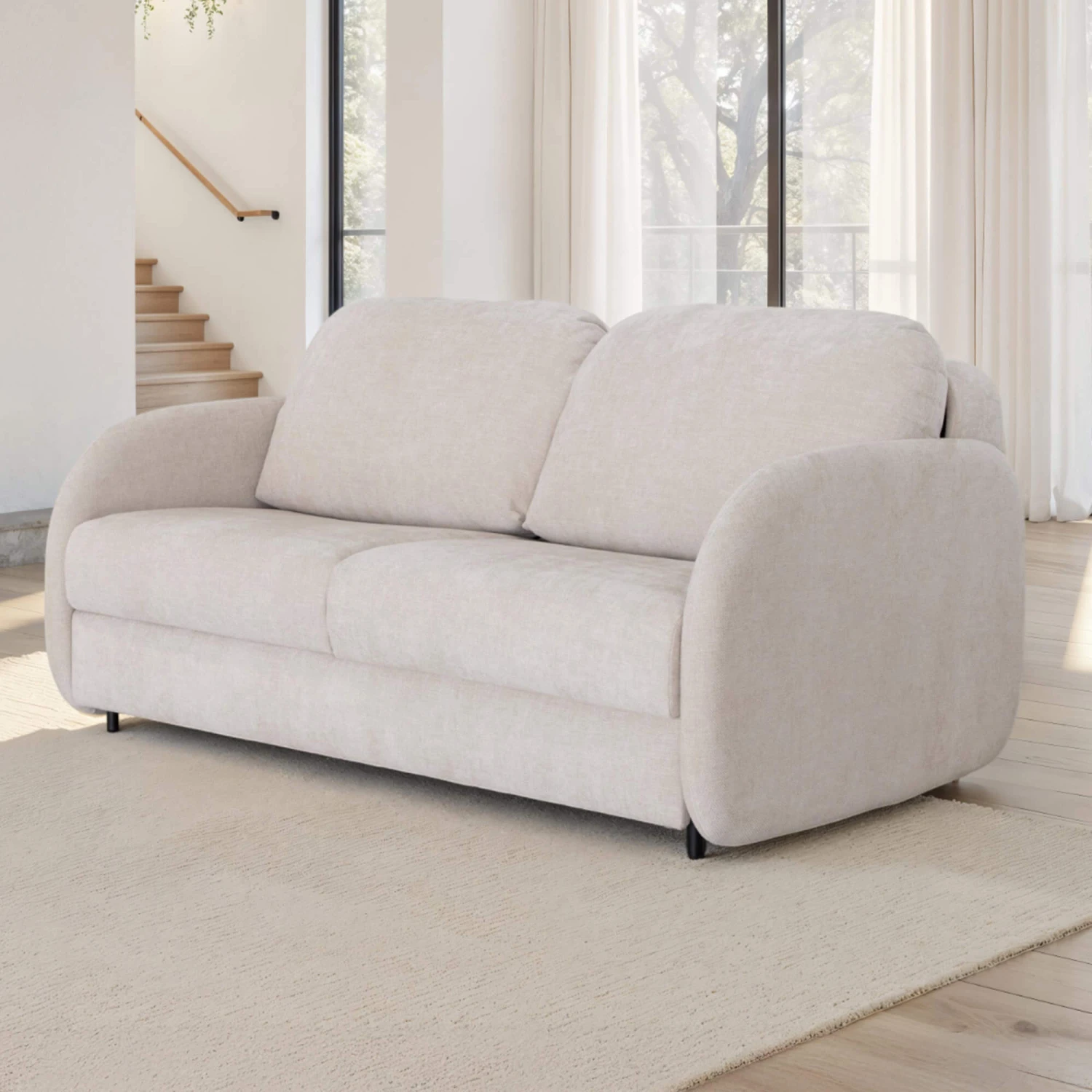 The Bopy Sofa Bed introduces a soft and playful aesthetic to your living space. Its design is defined by a gentle, rounded silhouette, with plush, large rectangular back cushions featuring elegantly curved corners that enhance the sofa’s cosy appeal. The rounded armrests with their smoothly curved edges contribute to the overall fluid and welcoming shape. This piece balances comfort with a clean, sophisticated look, all supported by a set of sleek, cylindrical black legs that provide a striking contrast and add a touch of minimalist style. The cream fabric upholstery adds a light and airy feel, making the sofa a versatile addition that can be easily styled with a range of cushions and throws.
