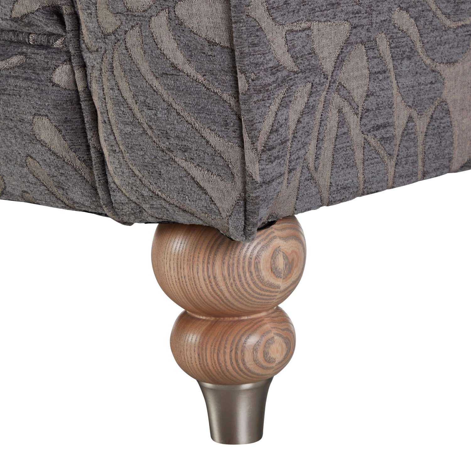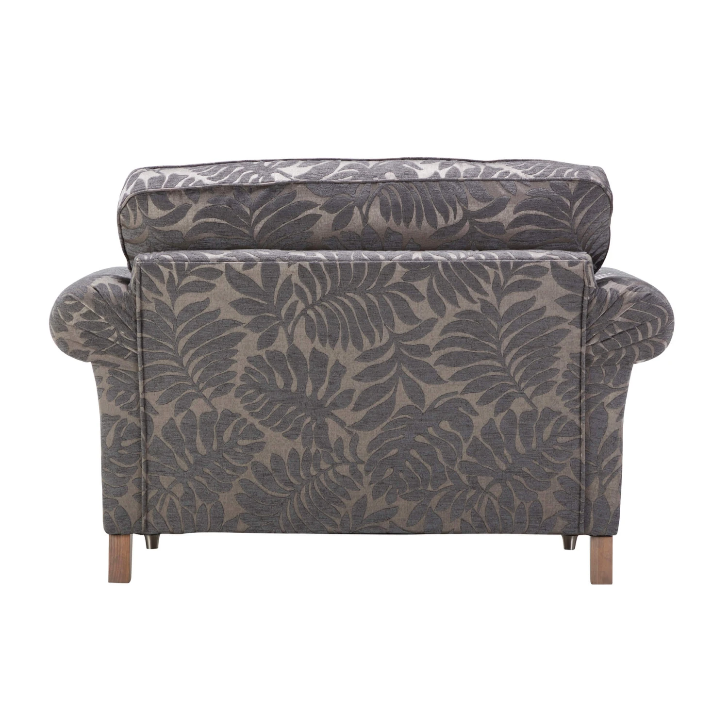 Packed with timeless character and traditional charm, the Carolina Grey Leaf Patterned Fabric Snuggler Sofa inherits the hallmarks of high quality detailing that we associate with the best of British manufacturing. Each piece is hand crafted with meticulous detailing, with a gorgeous palette of charcoal grey chenille and leafy patterned fabrics to create a fusion of texture and interest.