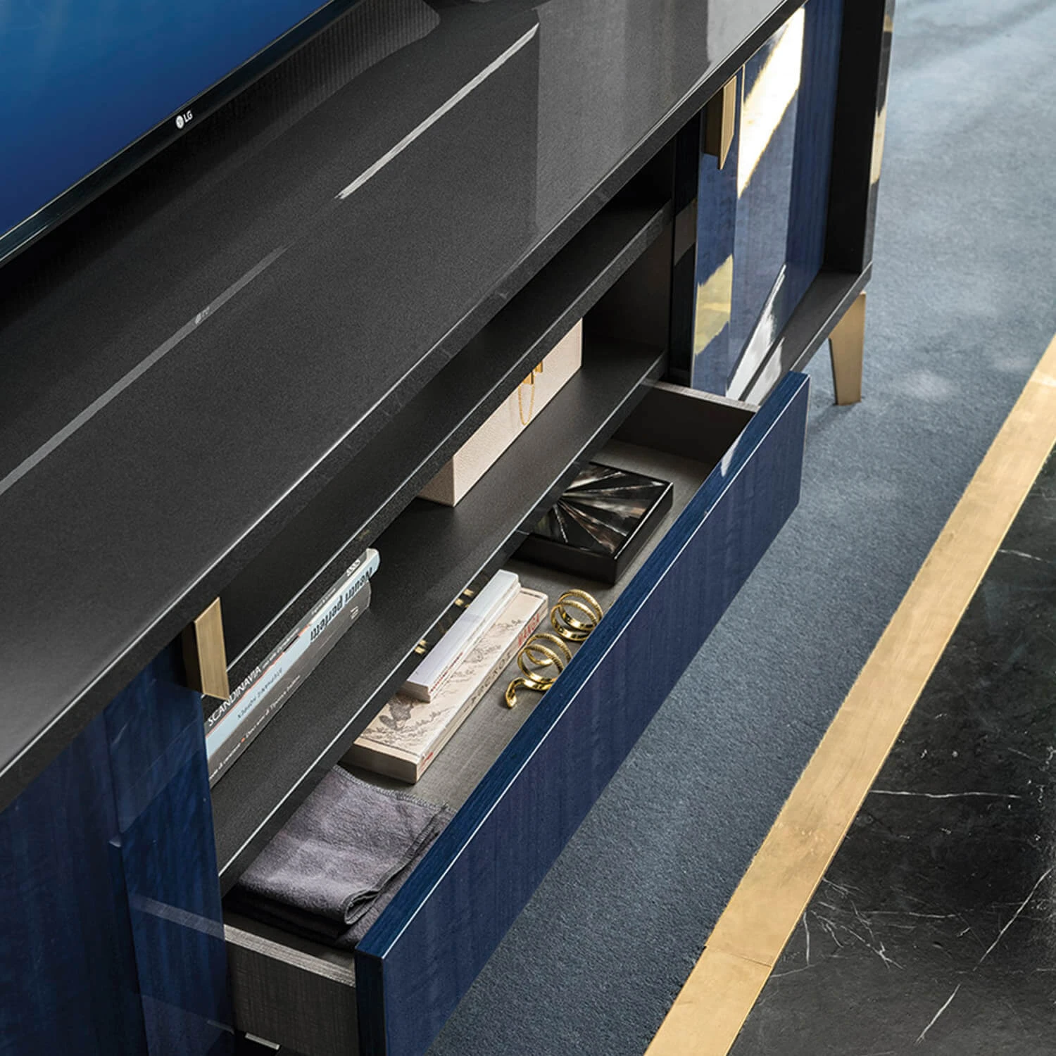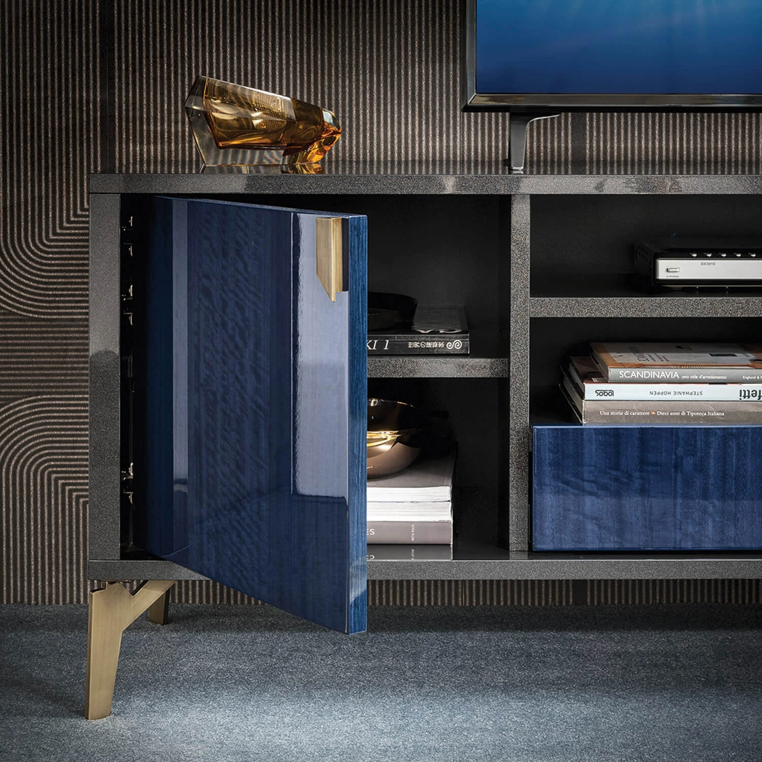 The veneers are made from genuine eucalyptus wood to ensure that no piece is exactly alike and comes with its own, unique look and set of characteristics. A high-gloss lacquered finish creates a lavish, light reflective surface which further elevates the decadent look of this piece, whilst the dark grey body provides a stark contrast to the vivid cobalt blue hue of the wood grain door and drawer fronts. The stylish geometric design and brushed brass finish of the handle and legs lend this TV unit its indulgent, art deco aura, which will enrich any décor by translating a sense of class and timeless sophistication into its surroundings.