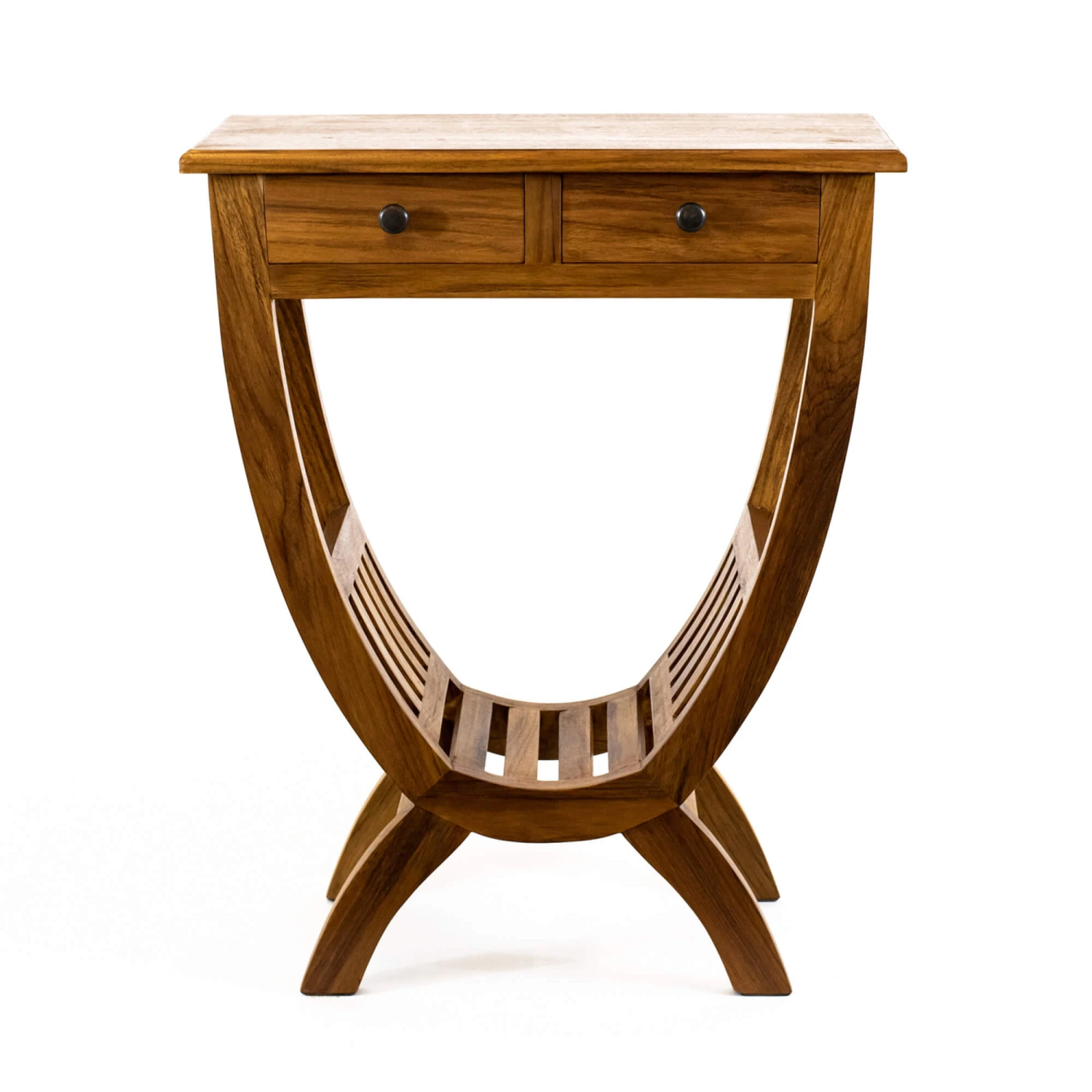 A durable hand-crafted console table that is crafted from a strong teakwood. Featuring two drawers it provides you with ample space to store accessories such as jewellery and remotes. On the base is a small shelf with two supportive edges, making it ideal for stacking and storing books or even a pair of shoes. With 4 curved legs, it adds character to the unit.