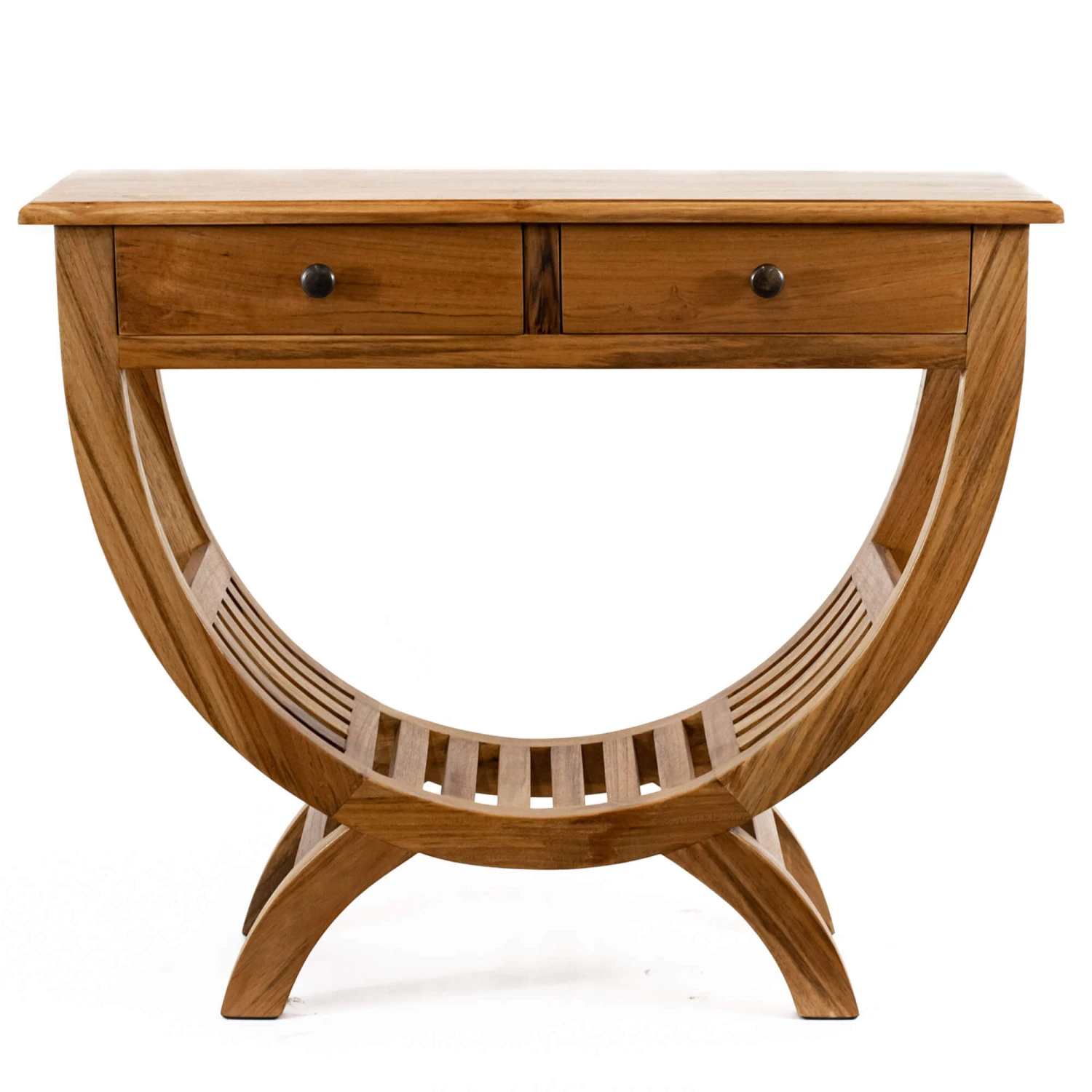 A semi-circular hall table hand-crafted from durable teak wood. The unit features two spacious drawers at the top of the unit, that are accented by dark wooden handles. On the base are 4 rounded legs that add a contemporary touch to the unit.