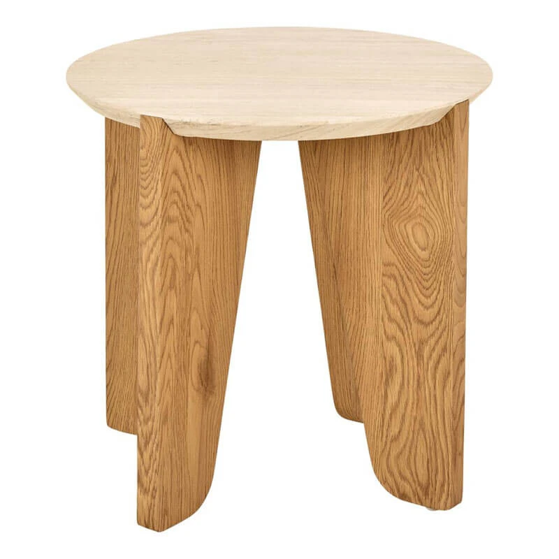 A round, travertine effect side table that features distinct light oak coloured legs and a circular travertine-effect top in a soft, cream colour, creating a natural warm feel. The table top has a knife edge, partly mirroring the shape of the tables 4 legs.