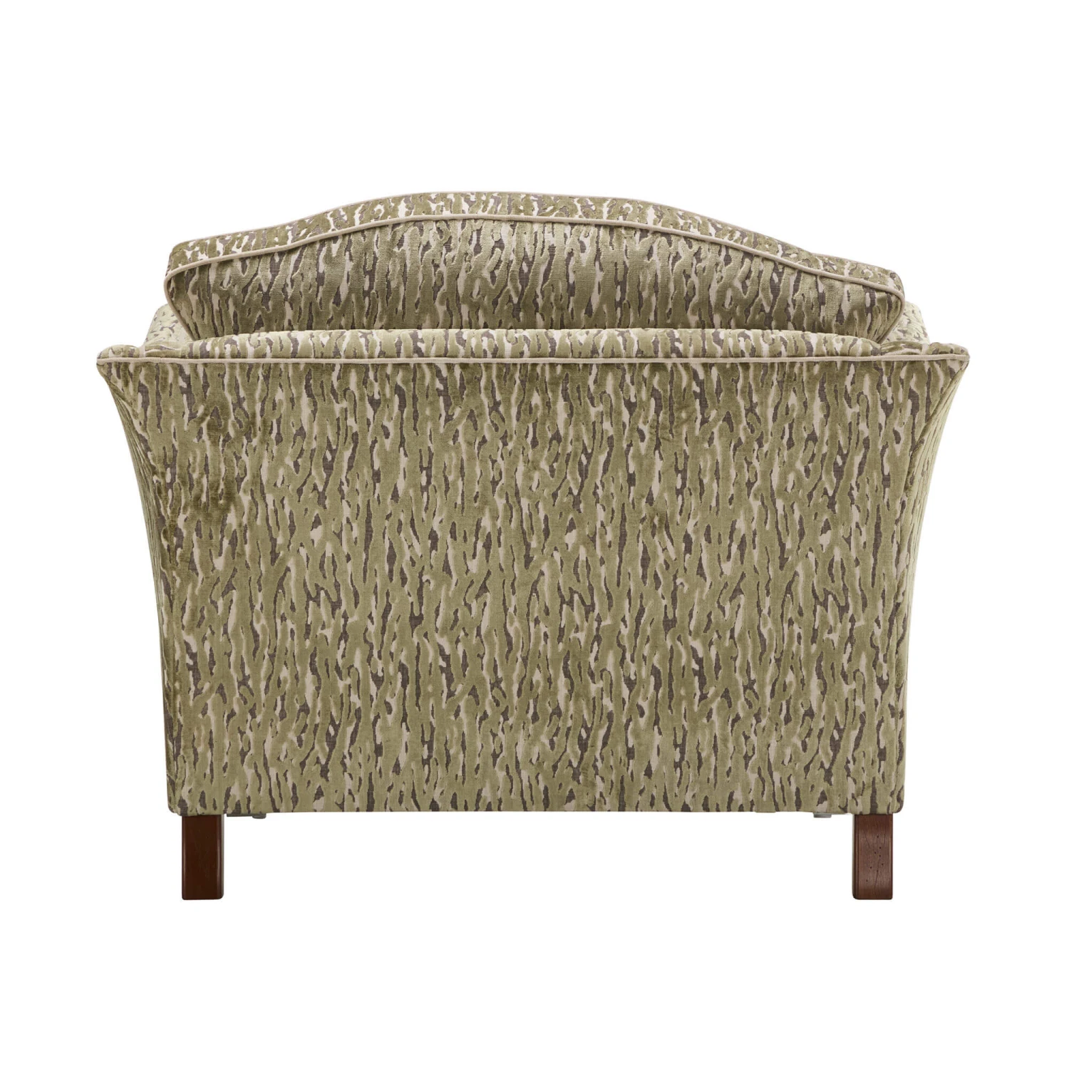 The Valencia Camino Sage Fabric Loveseat by David Gundry is a timeless expression of elegance and comfort. Upholstered in a textured patterned Camino sage fabric, the Valencia showcases a refined silhouette with graceful lines, sumptuous cushions, gently splayed arms, a gracefully scalloped back, a contrast piping and wenge wooden legs with a chrome metal finish, creating a rich and sophisticated statement piece.