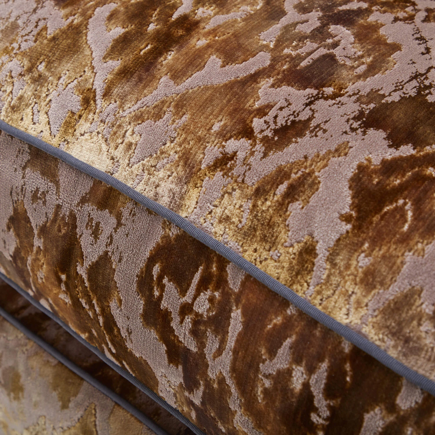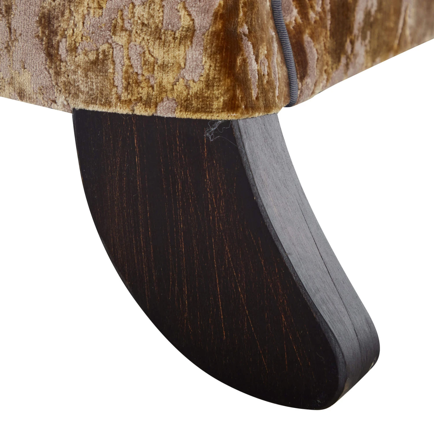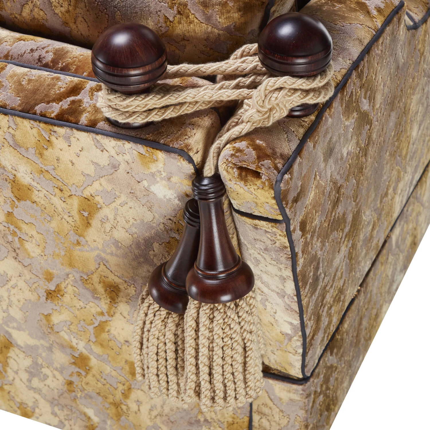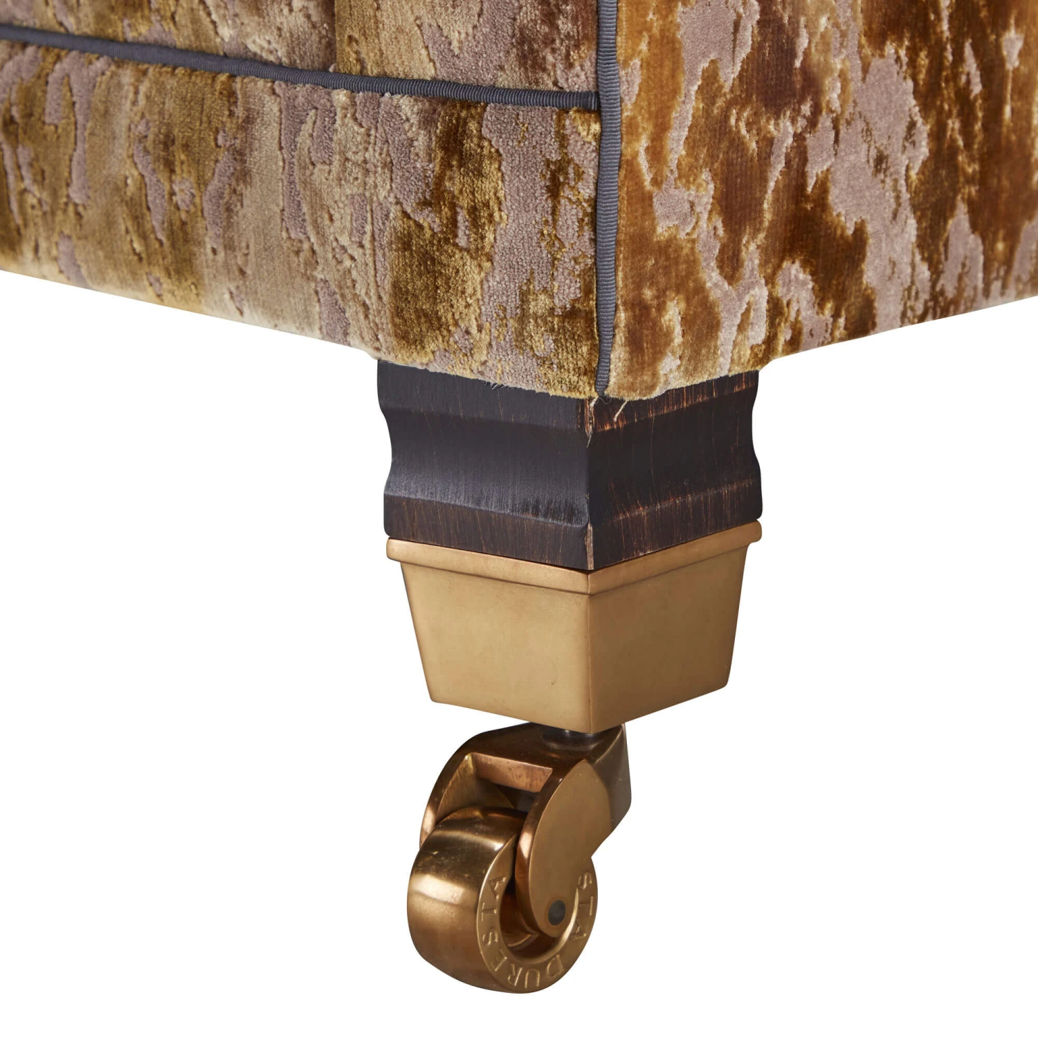 The Hornblower Imperial Gold Fabric 3 Seater Sofa from Duresta is an iconic design with a luxurious look and feel. Upholstered in an Imperial gold patterned fabric, the Hornblower sofa features a concave curved front, curved drop arms fastened together with white gold tasselled tiebacks, contrasting Grosgrain grey piping and umber wood with antique brass metal castor feet, creating a classic English statement style that has been carefully reinvented for the modern home.