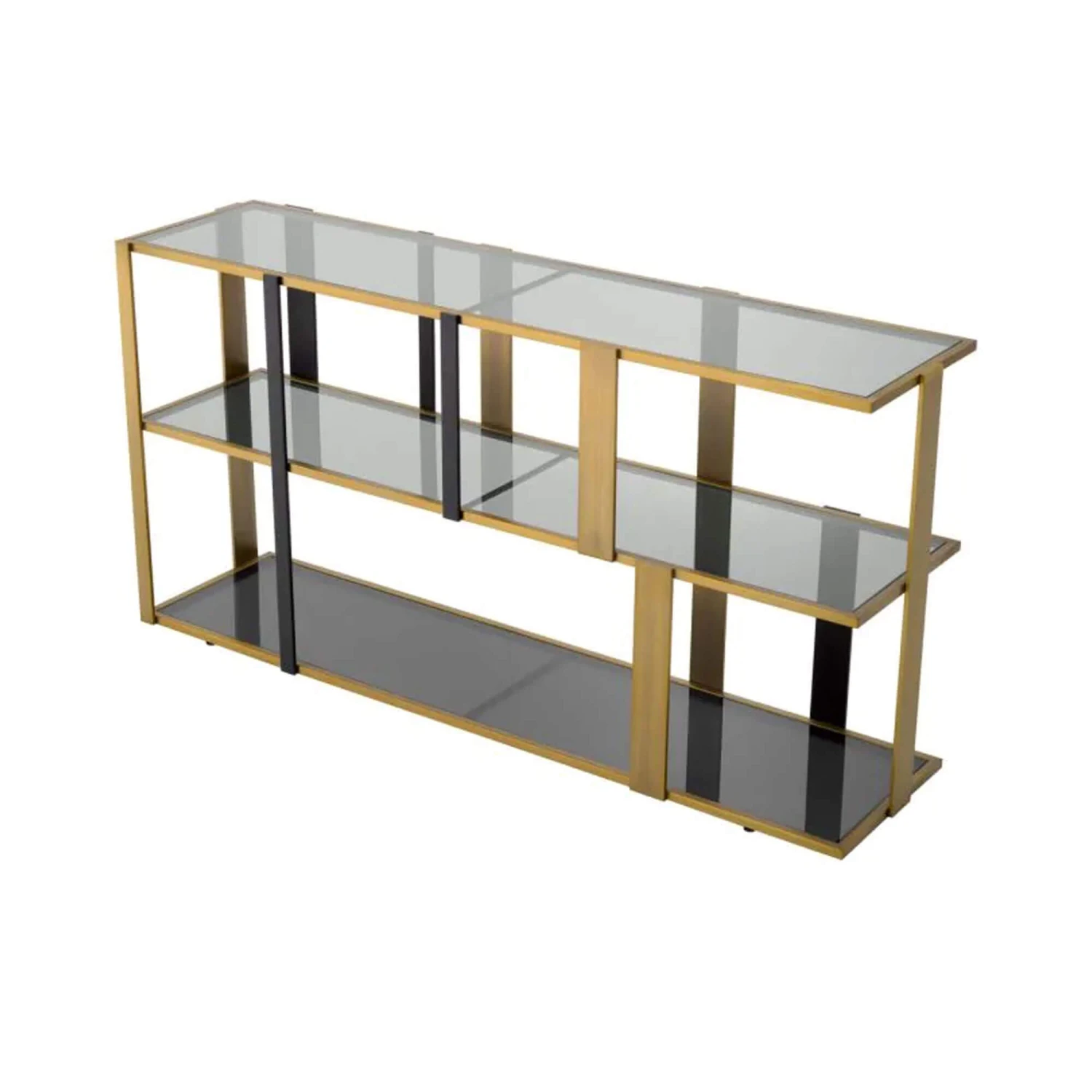 The stunning low cabinet is an excellent fusion of contemporary design and luxurious style. Designed with black frosted glass shelving in a unique design to display your favourite accessories. Crafted with a brushed brass frame that gives a luxe finish to beautifully finish your space.