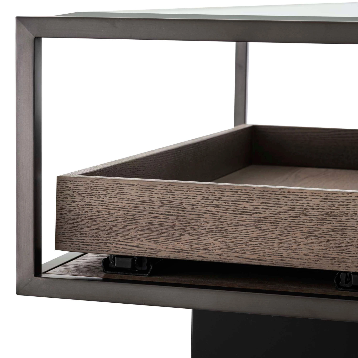 Create a striking look in your living room with this hand crafted by skilled artisans display box style coffee table featuring three grey veneer pull-out drawers on rails making your magazines and remotes easily accessible while always clearly visible through the glass top resting on a bronze finish frame.