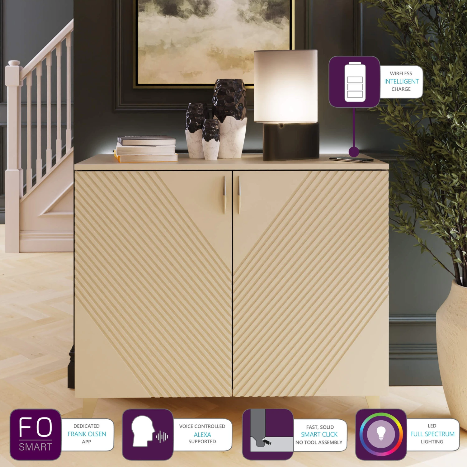Control the integrated LED lights through the Frank Olsen App or voice commands via your SMART speaker, that also controls the LED rear mood lighting with a full colour spectrum. Designed with a discreet wireless phone charging point for convenience.