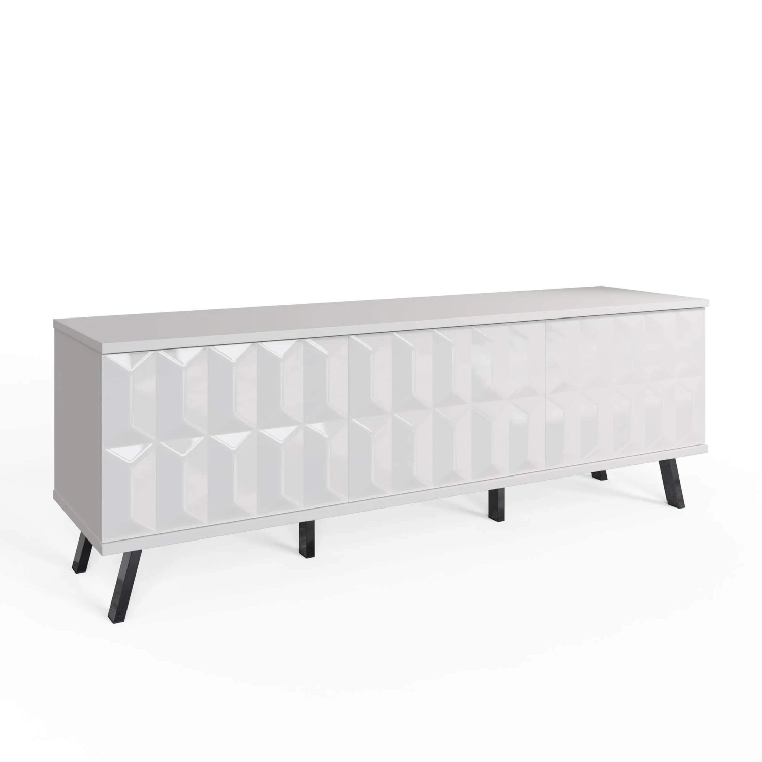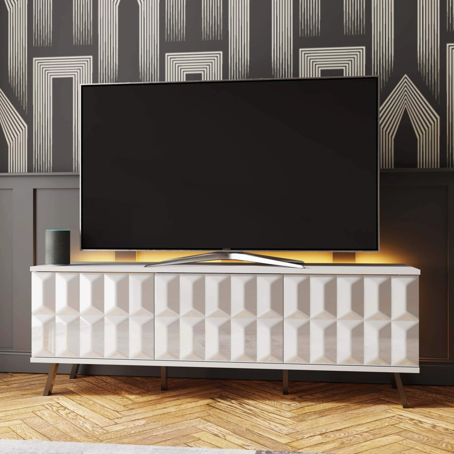 The Elevate White TV Unit features a bold look, with a high-shine painted, textured geometric doors and complementing satin finish to the main body, elevated by high shine smoked grey legs to complete the look. The TV Unit has intelligent eye remote control allowing up to six pieces of AV equipment to be operated with the doors closed, so you can neatly store away your TV equipment with no unsightly cables or wires on show. The TV Unit also features integrated full colour spectrum LED lighting, which can be controlled with the Frank Olsen app or by voice command with SMART speaker.