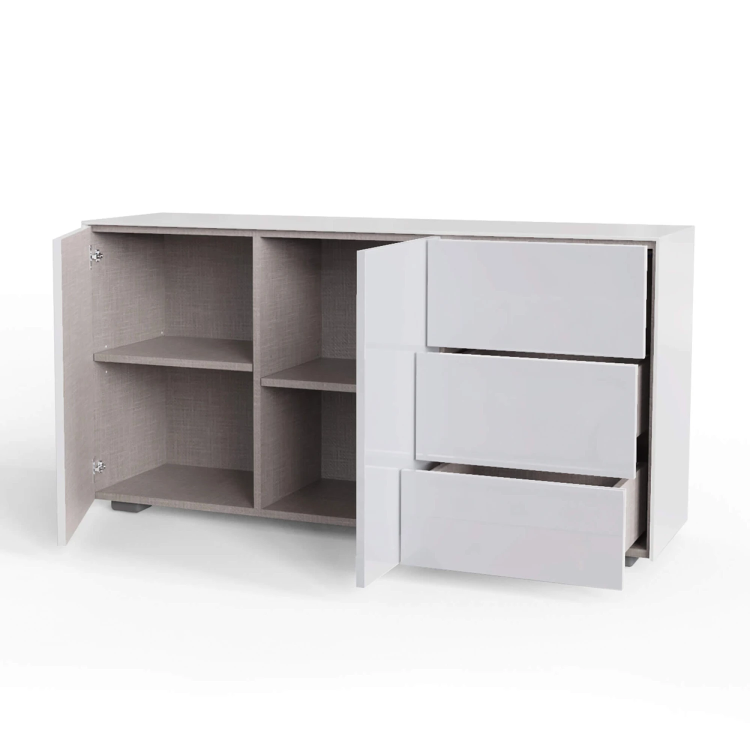 Created with style and functionality in mind, the Intelligent Sideboard boasts a scratch resistant, high gloss white exterior with matching glass top and a textured grey interior with adjustable internal shelves. The combination of an ultra-chic design and superb technology makes this a must-have piece of furniture for any modern home.