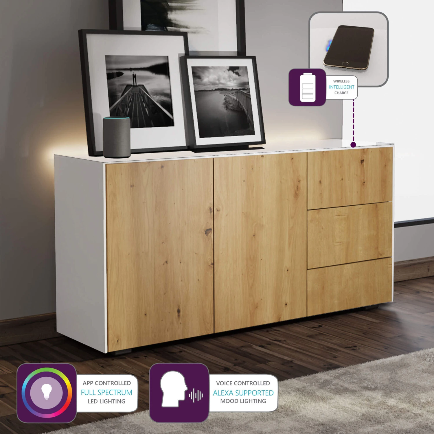 This stylish, modern sideboard would make a welcome addition to any contemporary home, with ample storage space across two cupboards and three side drawers and a chic white gloss exterior with oak effect doors and glass top. Part of the Intelligent furniture range, the sideboard features a wireless phone charging compatibility (QI standard) and full colour spectrum, ambient smart LED lighting. The sleek design and smart technology make it an eye-catching and practical piece of furniture with an on-trend, minimalistic style suitable for any room in the home.