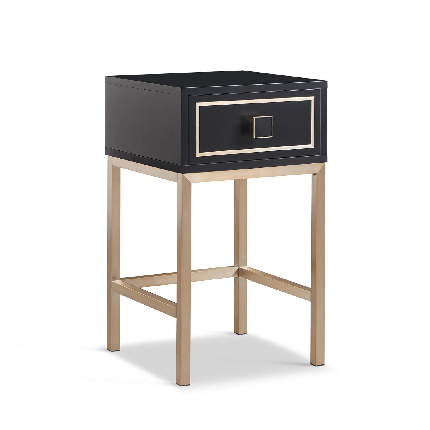The Frank Olsen Mia Black Side Table is a sophisticated piece, perfect for modern interiors. The satin painted cabinet top and doors are finished in a sleek matte black, providing a striking backdrop for the inset metallic detailing. The inlay warm bronze details are a key design feature, complimented by a square bronze handle which also has a matte black finish on the front. This combination of textures and finishes, along with the metallic brushed bronze touches, gives the side a luxurious and contemporary feel.