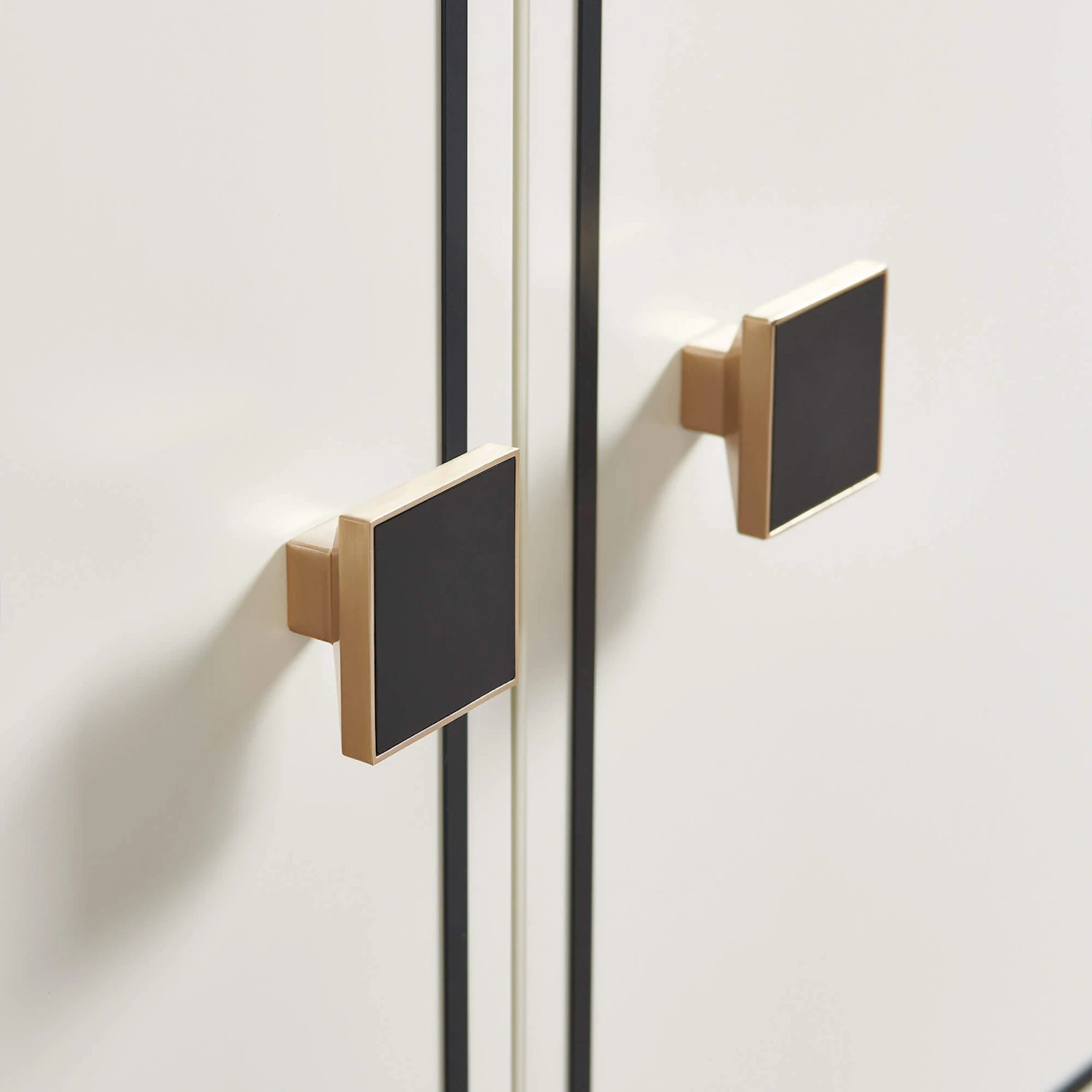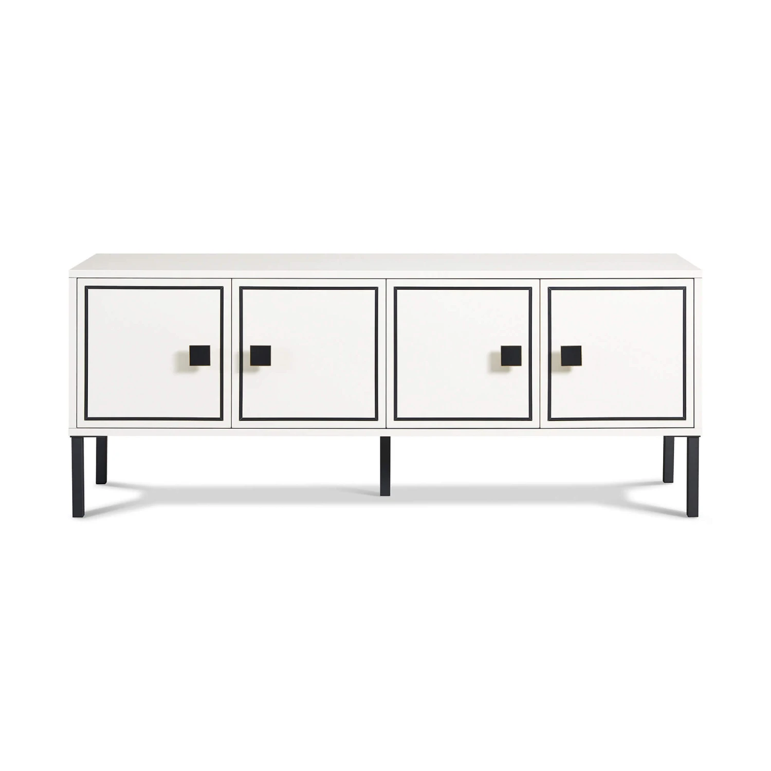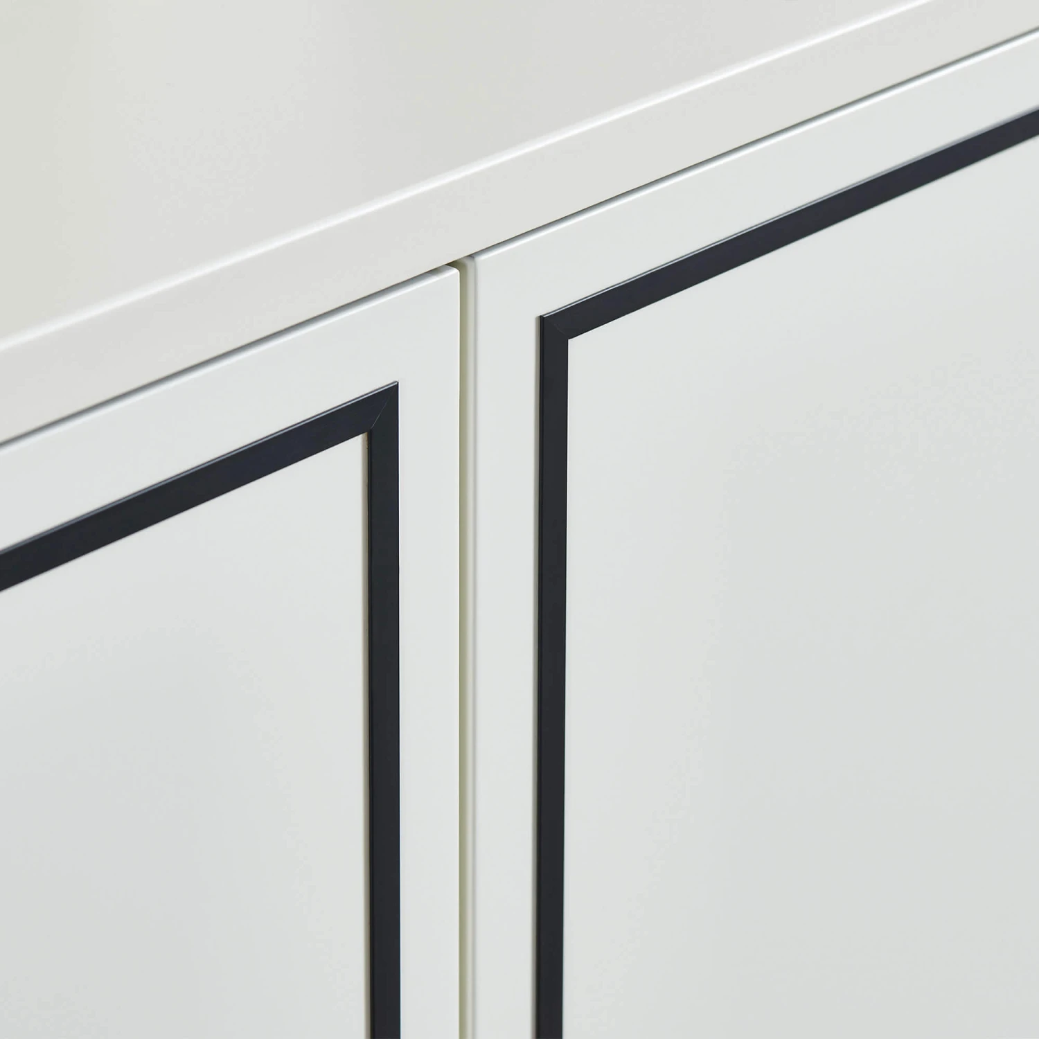 The Frank Olsen Mia Large White TV Stand is a sophisticated piece, perfect for modern interiors. The satin painted cabinet top and doors are finished in a sleek matte white, providing a striking backdrop for the inset metallic detailing. The inlay striking black details are a key design feature, complimented by square bronze handles which also have a matte black finish on the front. This combination of textures and finishes, along with the metallic brushed bronze touches, gives the sideboard a luxurious and contemporary feel.