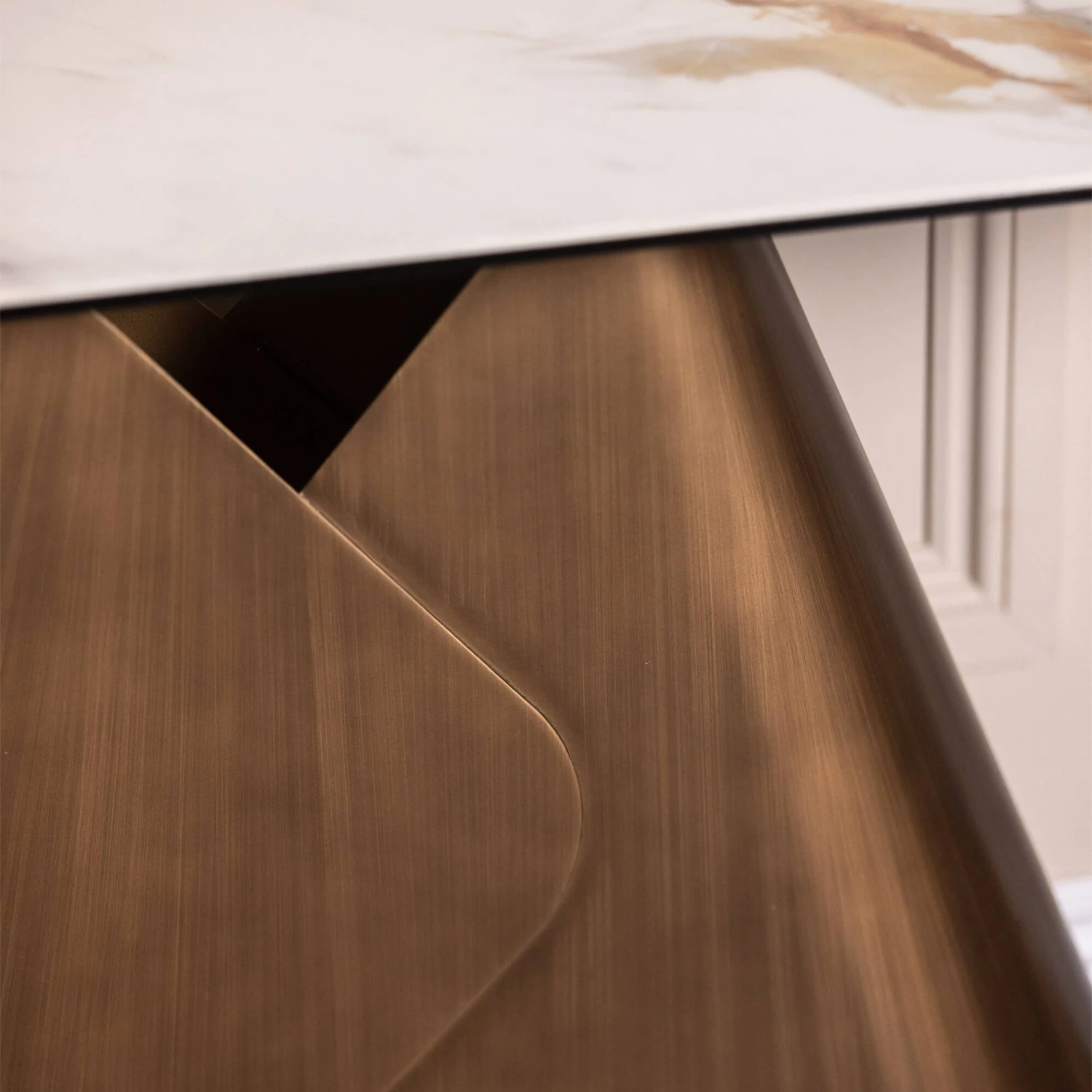 Beneath, the table’s architectural base makes a bold statement with overlapping, arching legs in a rich bronze-coloured finish. The twin flared supports form an open, sculptural shape, enhanced by a vertical brushed texture that catches the light beautifully. This distinctive design balances contemporary style with a sense of grounded elegance, making it an ideal centrepiece for any luxury living space seeking both visual intrigue and timeless appeal.