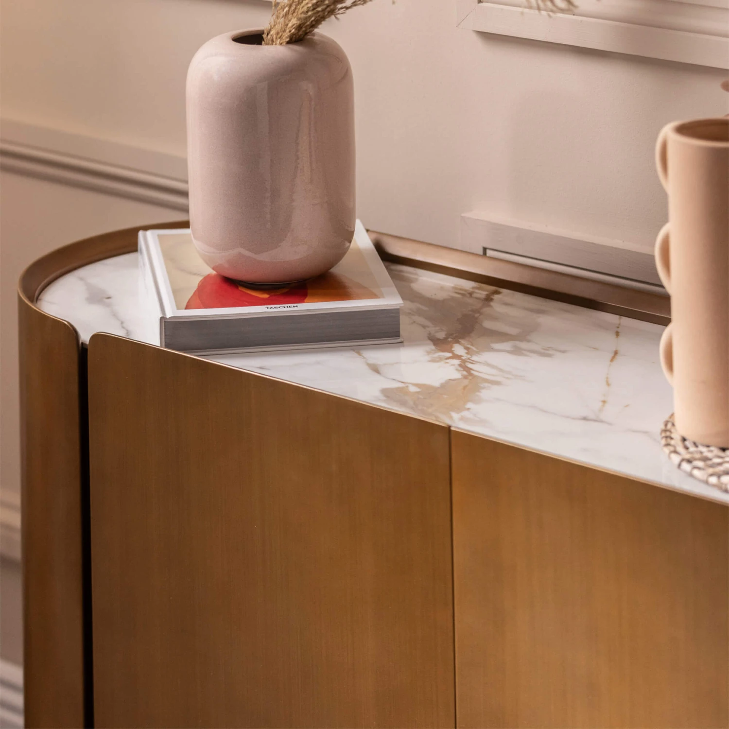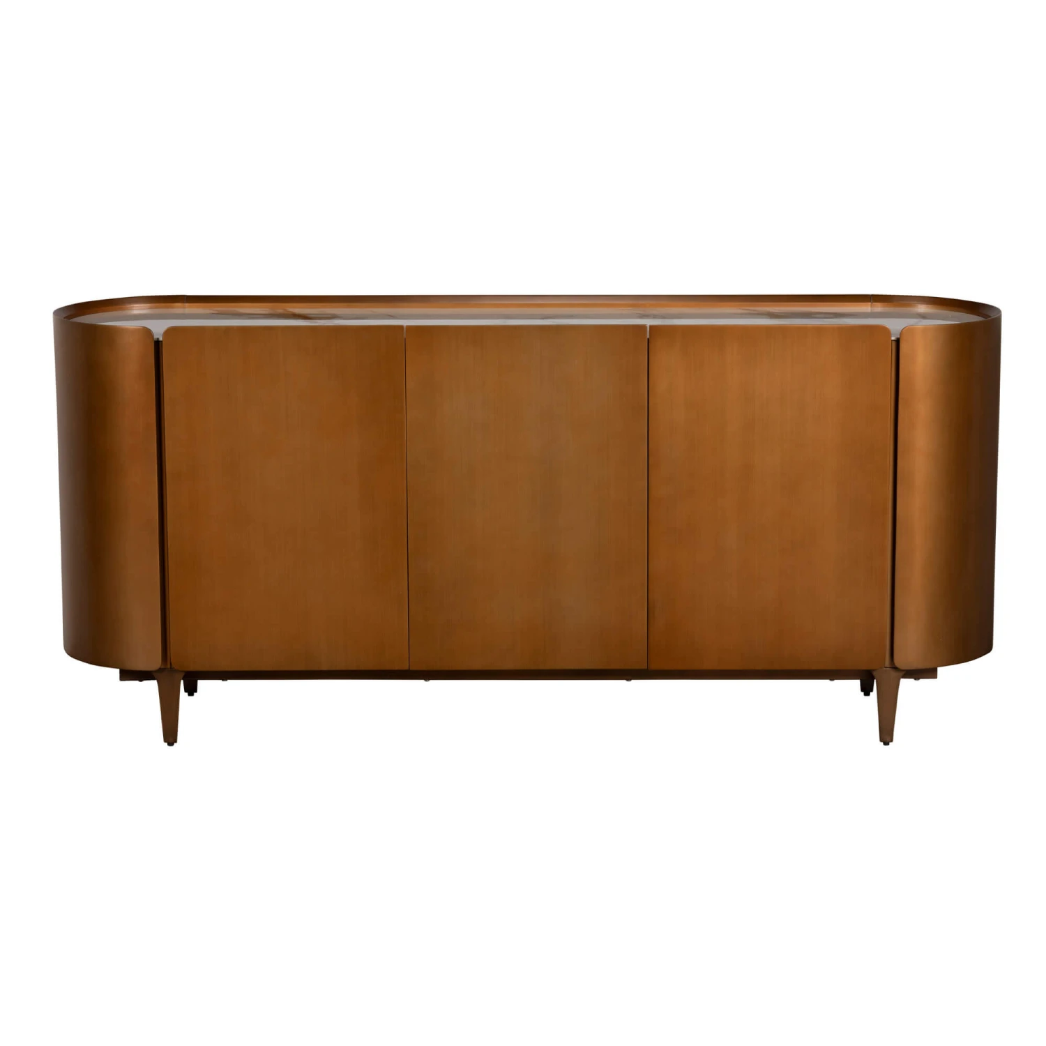 Designed for modern homes, the wide sideboard features three doors crafted from oversized bronze coloured panels with elegantly curved edges which extend slightly above the pristine white ceramic top, creating a distinct lip at the top of the sideboard. The sideboards rounded edges and slender bronze legs lend a refined lightness to design , whilst soft natural veining within the ceramic top adds subtle depth and sophistication.