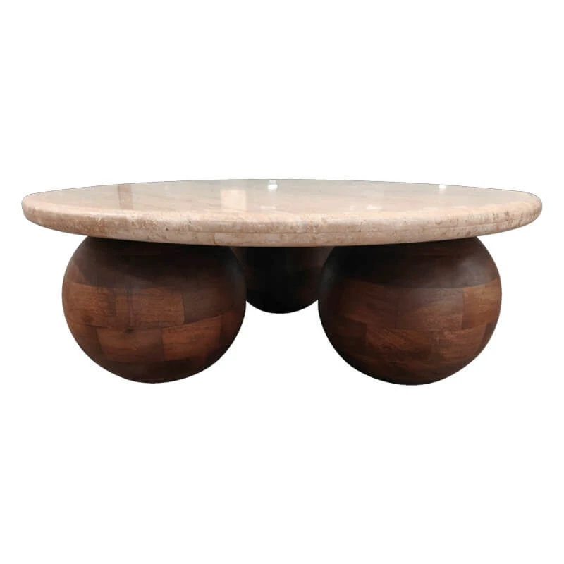Supporting this luxurious top are three prominent spheres crafted from dark brown mango wood, which serve as the table’s unique base. These spherical elements appear as if they are constructed from meticulously arranged wooden panels wrapping around the spheres, creating a textured and tactile look that contrasts beautifully with the smooth travertine. The base features a complementary matte finish, highlighting the rich tones of the wood and the intricate construction.