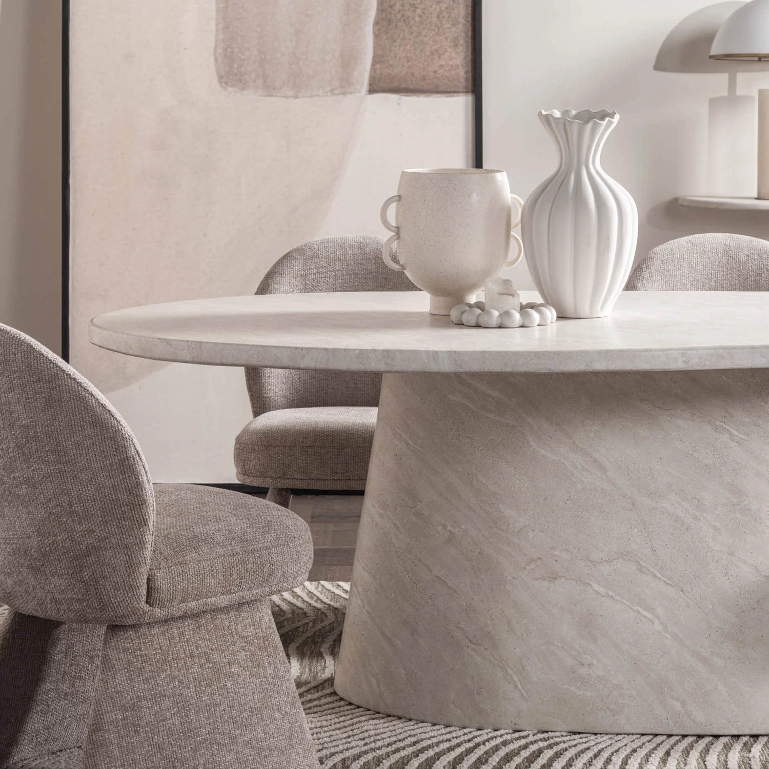 Supported by a large, sloping podium base, the Glass House Solna 200cm Travertine Effect Dining Table offers exceptional stability and a sculptural presence that enhances its organic appeal. Its neutral tones and understated design allow it to blend seamlessly with a variety of interior styles, making it the ideal neutral dining table for those who appreciate both style and versatility. Whether you’re seeking a travertine dining table or an organic dining table that stands out for its contemporary character, this piece promises to elevate your home with timeless sophistication.