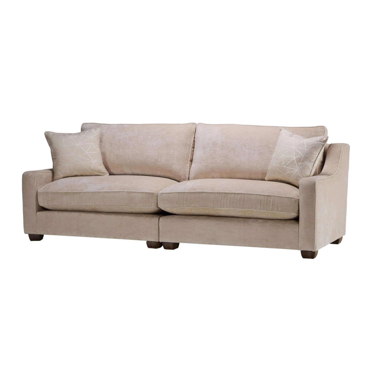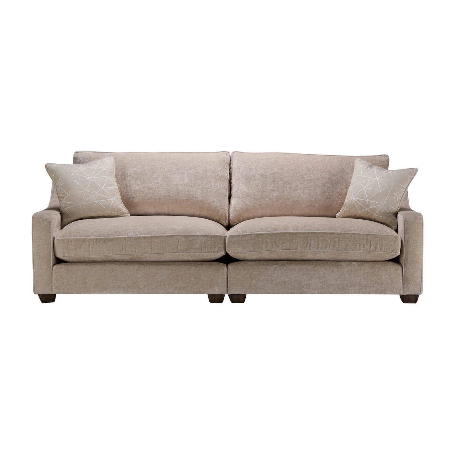The Haddon Imperial Oyster Fabric 4 Seater Sofa is the embodiment of understated elegance and sumptuous comfort. Upholstered in a warm imperial oyster fabric with subtle texture, the Haddon features clean lines, elegant sloped arms, generously padded cushions, lovely almond piped detailing and contemporary mocha show wood stain legs, creating a timeless and sophisticated piece.