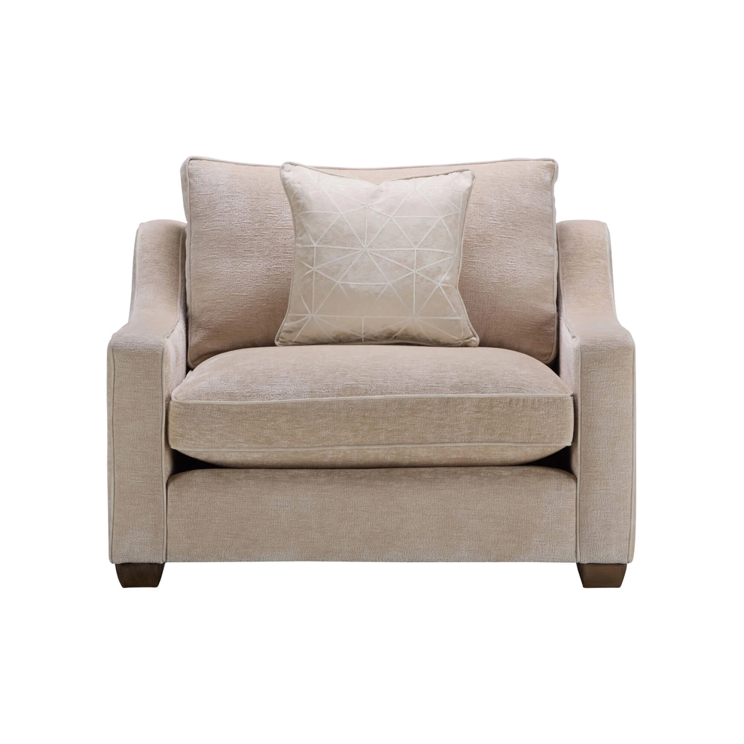 The Haddon Imperial Oyster Fabric Snuggler Chair is the embodiment of understated elegance and sumptuous comfort. Upholstered in a warm imperial oyster fabric with subtle texture, the Haddon features clean lines, elegant sloped arms, generously padded cushions, lovely almond piped detailing and contemporary mocha show wood stain legs, creating a timeless and sophisticated piece.