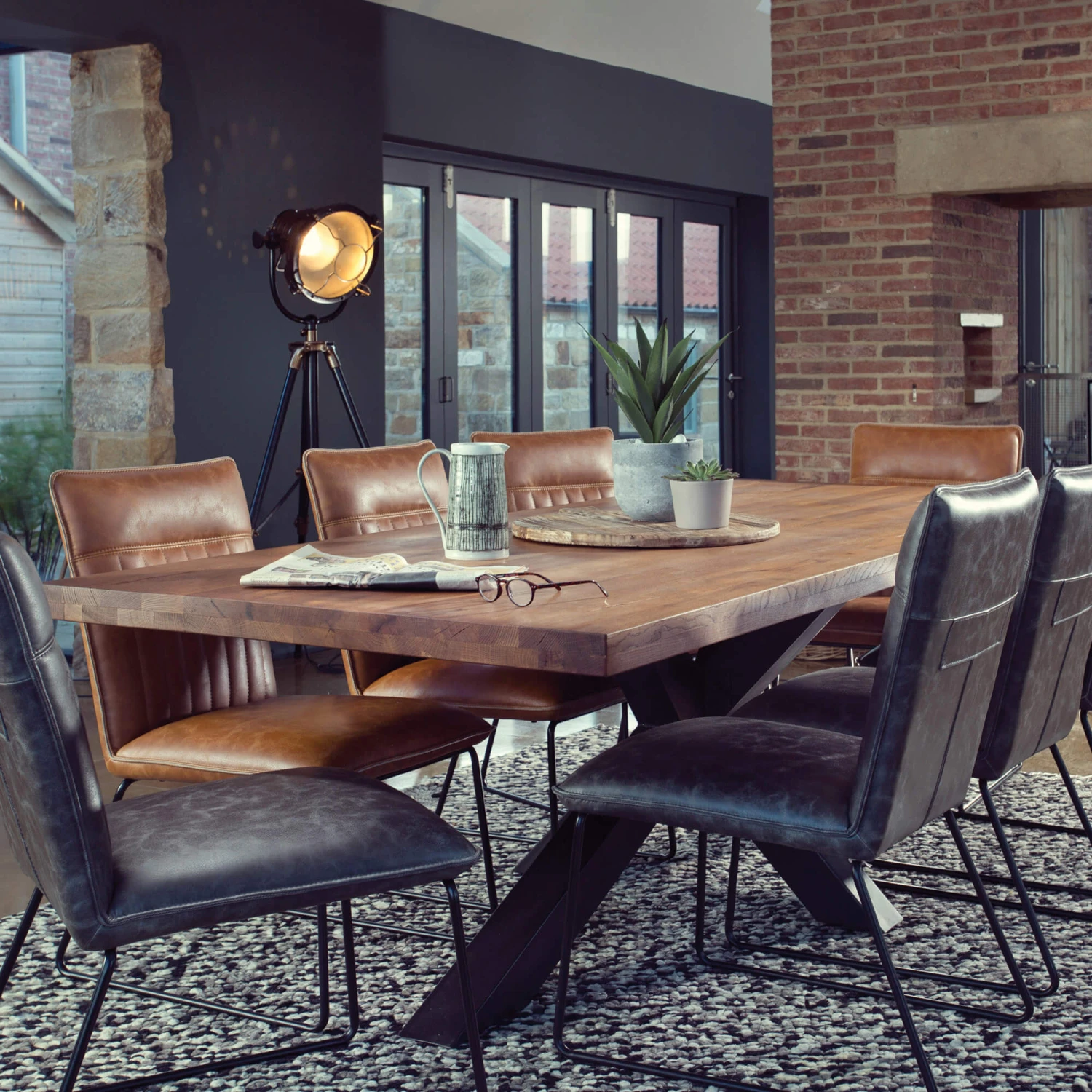 The distinctive matte black metal base makes a statement with its bold, cross shaped construction and contrasts the textured appearance of the oak top beautifully, whilst lending this dining table its alluring urban edge.