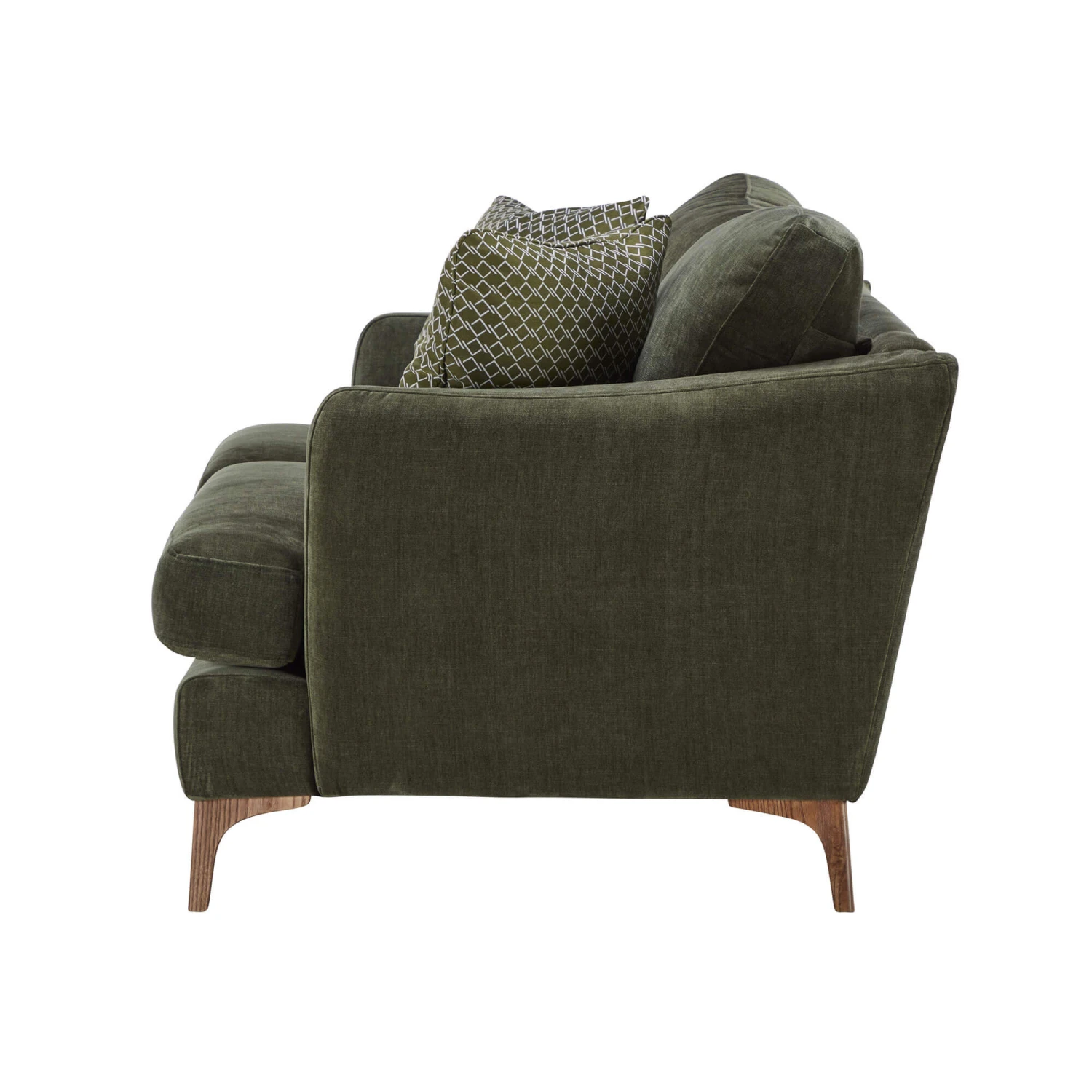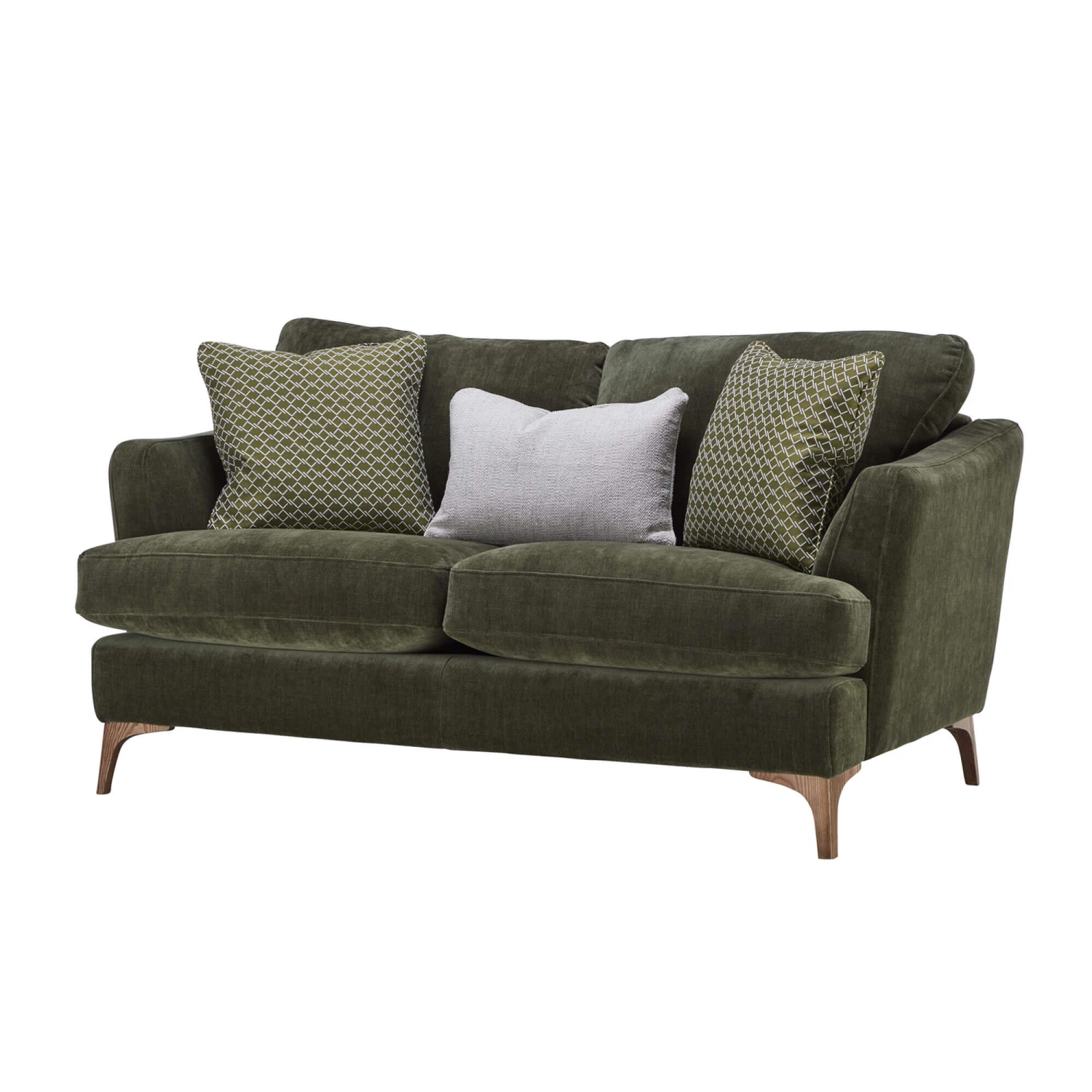 The sturdy, solid wood feet in a sophisticated smoke finish elevate the sofa and add a touch of natural beauty. The contrast between the green fabric and the smoke-coloured wood creates a visually striking piece, whilst three luxurious feather-filled scatter cushions in complementing patterns and textures complete the look.