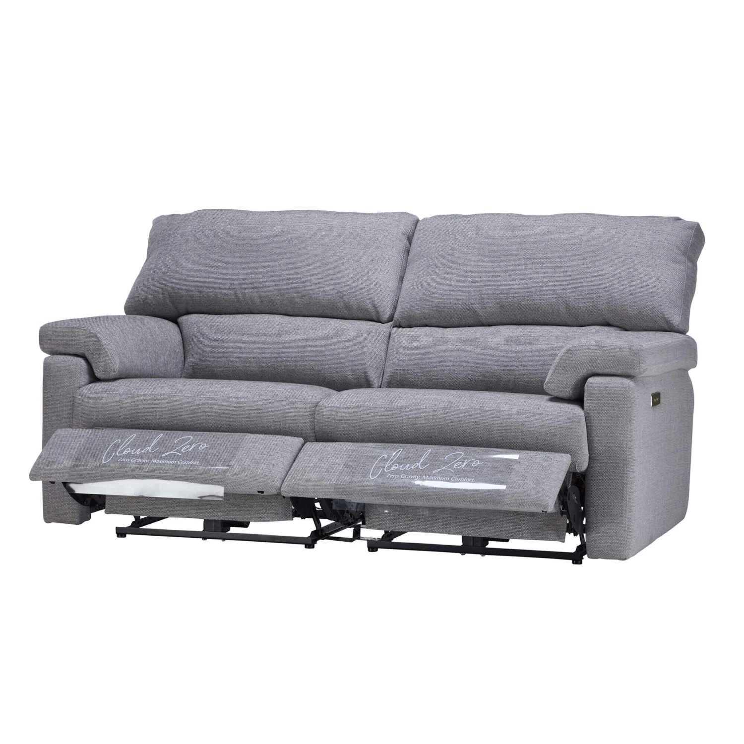 The Houston Grey Fabric 3 Seater Power Recliner Sofa is welcoming, distinctive and bold. Upholstered in a grey fabric, the Houston features sloped, padded armrests, generously padded cushions and black metal legs, creating a sophisticated and high quality piece.