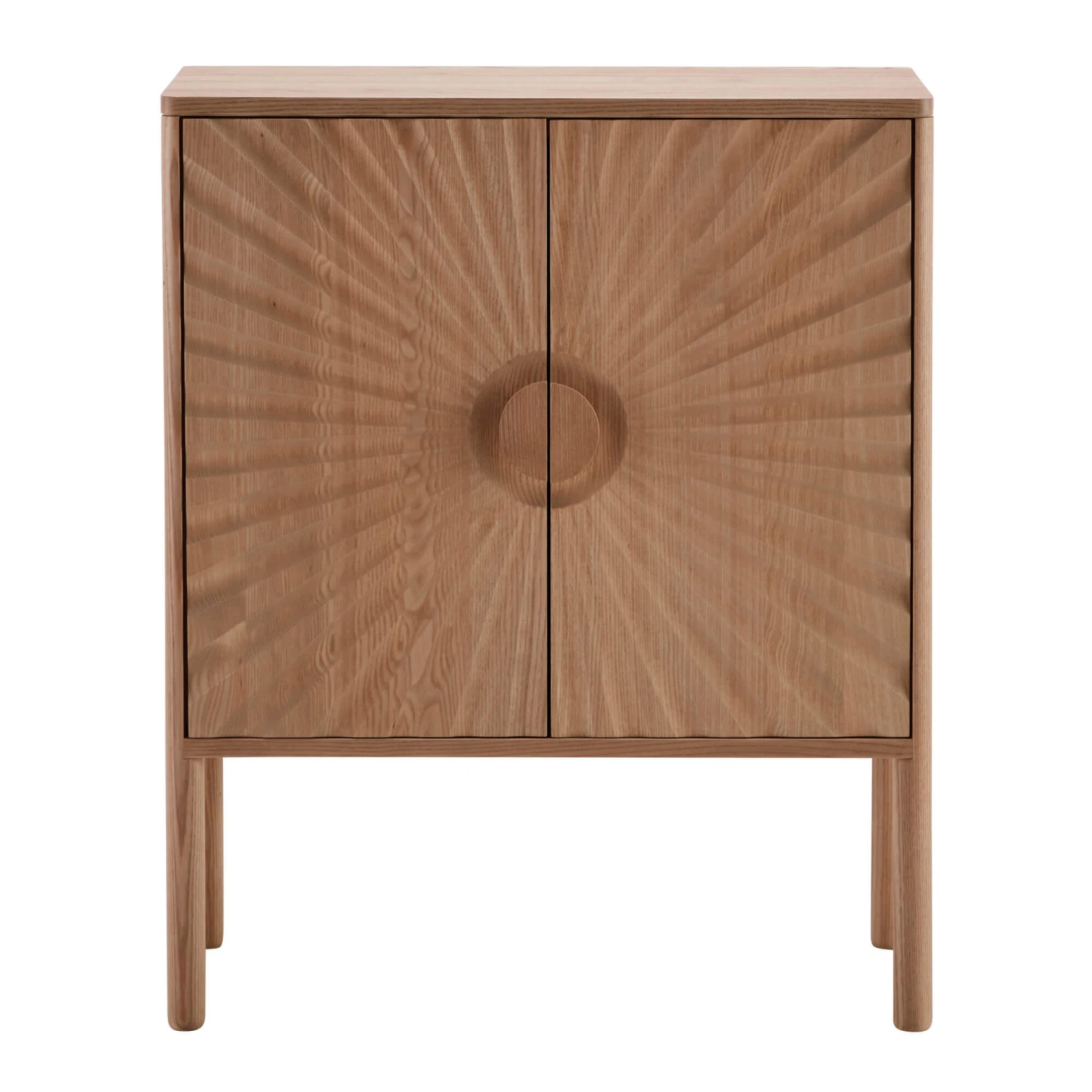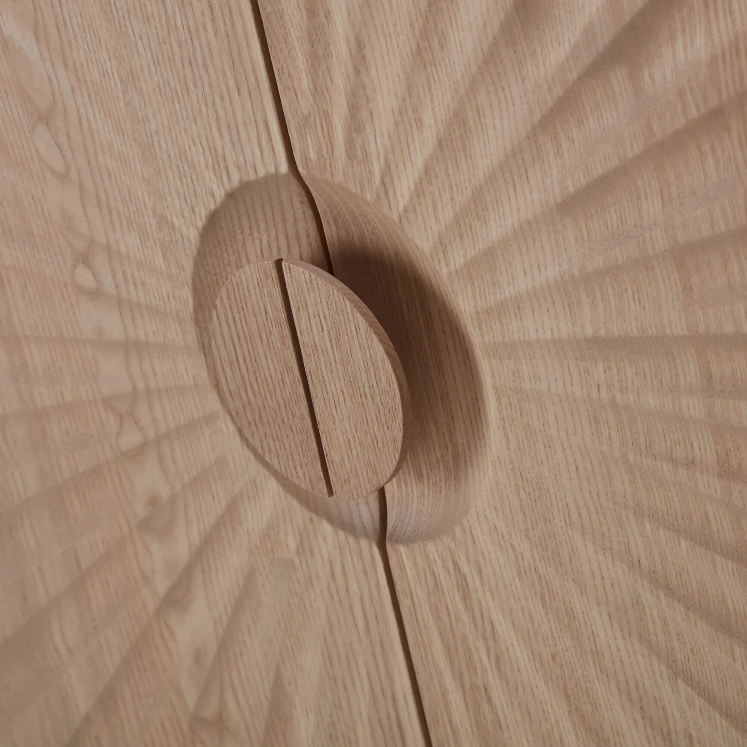 A softly sculpted sideboard with an embossed front that mimics the look of a ‘starburst’. The sideboard is made from solid ash wood with an oak finish, developing this sideboards character. Each of the solid legs have spherical feet, preventing unwanted scratches on surfaces and gives the piece a well rounded, clean look. In the middle is a raised round handle split into two, adding further depth and visual intrigue to the piece, whilst remaining practical. The top of the sideboard is flush with the doors, with each corner having rounded edges, contrasting the simple, clean lines creating a striking visual impact.