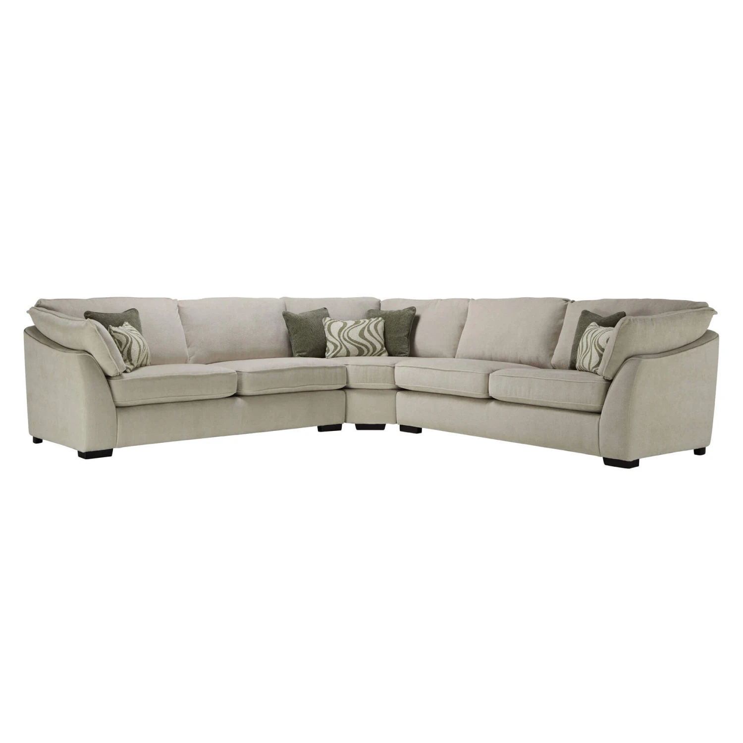 Accompanied with its subdued, oyster coloured fabric and beautifully formed silhouette, combining sleek lines with gentle slopes and characterful curves; the Imogen Corner Sofa is sure to fit seamlessly into any contemporary home, with its neutral colour palette and effortlessly elegant style. The Imogen Corner Sofa comes complete with four thyme green plain scatter cushions and three thyme green patterned bolster cushions.