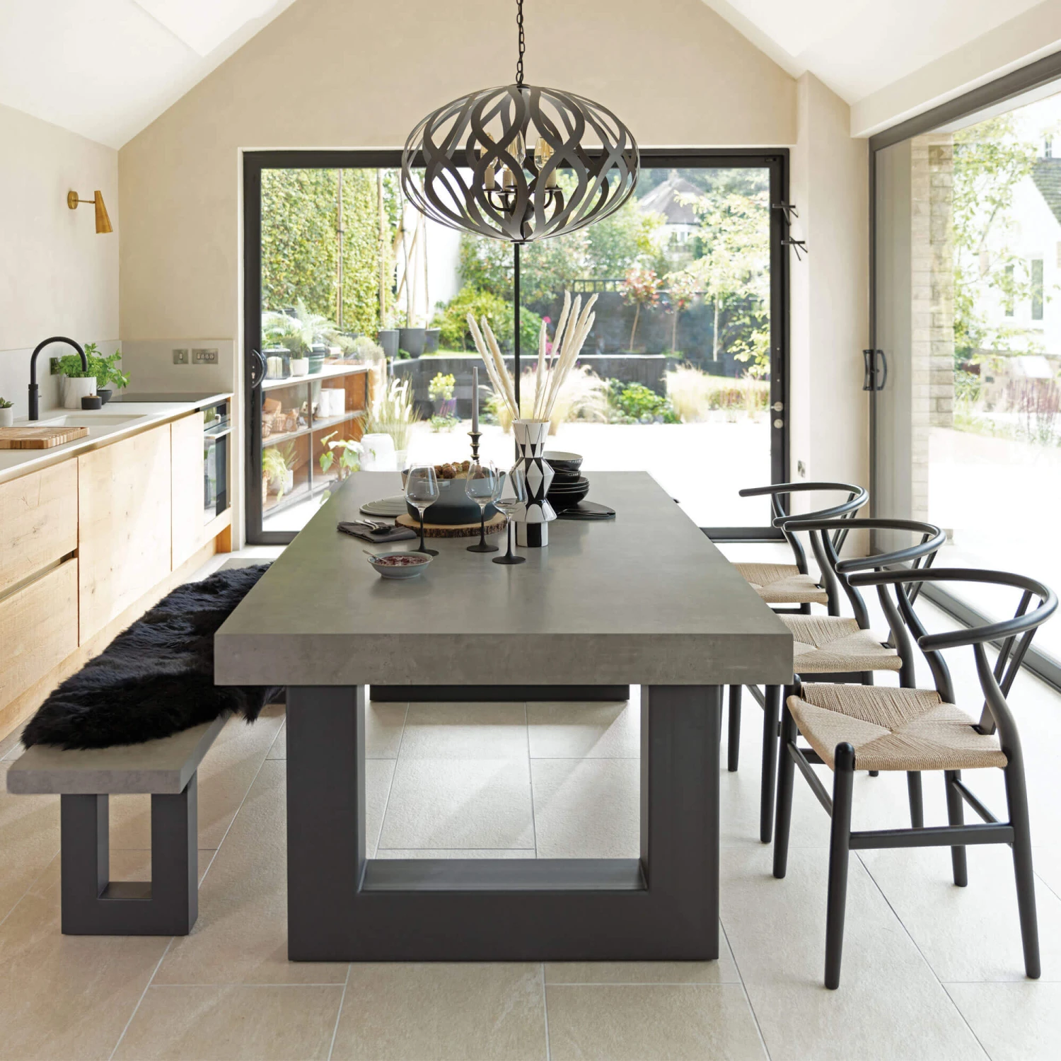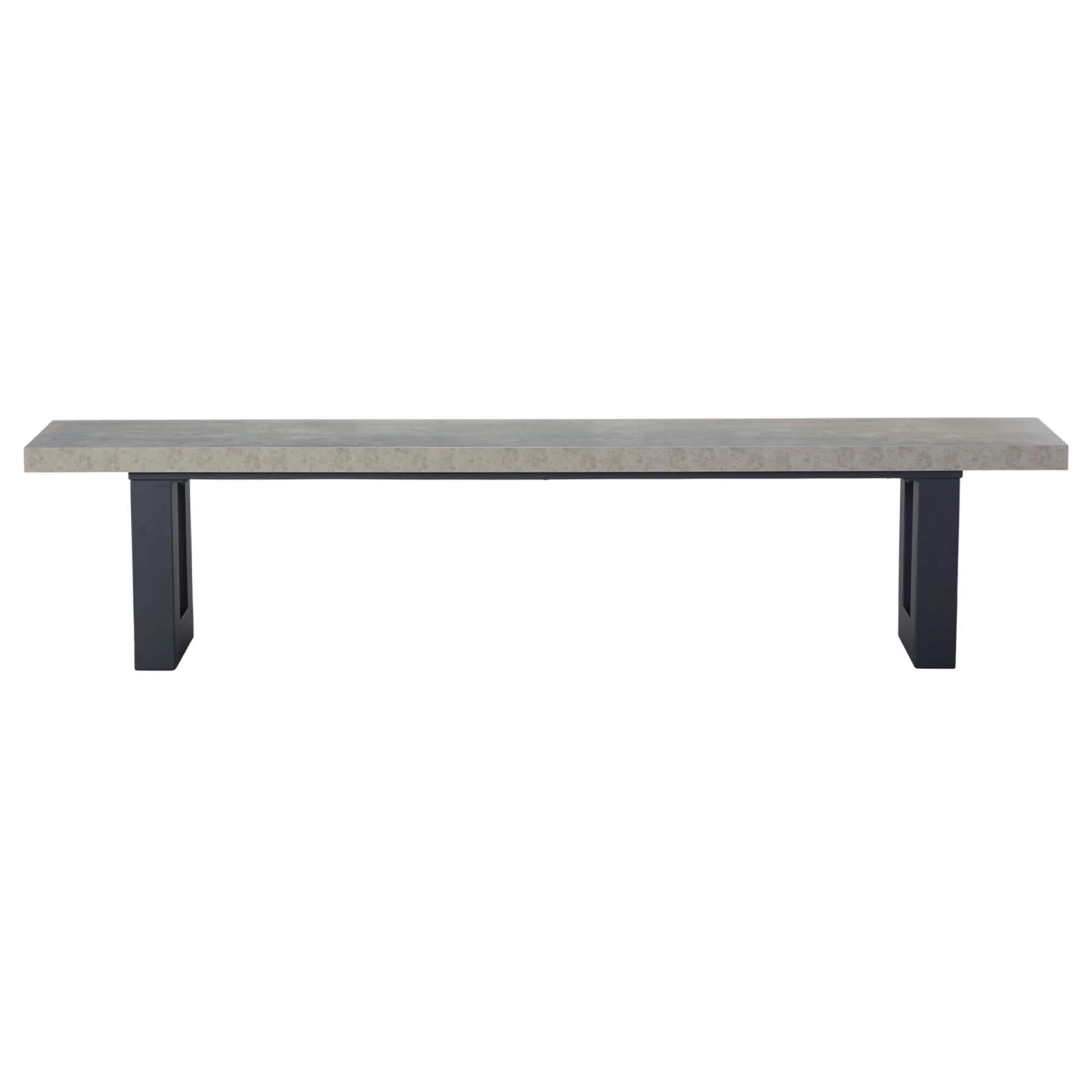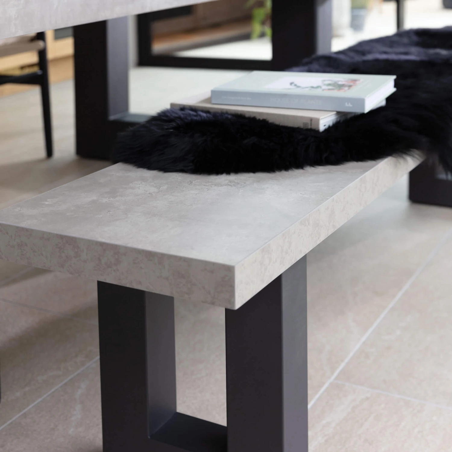 Urban industrialism at its finest, the Ingrid Concrete-Effect 160cm Dining Bench is a large, modern, dining chair alternative that is sure to take centre-stage in any dining area, with its immense size and striking features. The bold, chunky, structural style of the U-shaped, metal legs provide a striking contrast against the textural appearance of the top, with its large scale proportions and smooth, matte black finish. Completed with a concrete-effect, melamine coating on the top, the Ingrid is sure to refresh any dining room décor, with its on-trend, contemporary look and metropolitan flair.