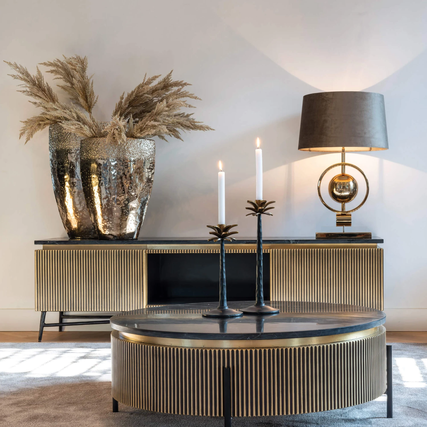 Designed to be noticed, the Ivette Round Gold & Black Marble Coffee Table is the height of extravagance with its lavish details and luxurious combination of black and gold. Elegantly refined with its sleek, streamlined silhouette, exquisite antique brass finish and natural black marble top, the Ivette was made to stand out. Its distinct, reeded surface on the sides makes a truly captivating, original feature and lends this table its urbane industrial allure, by creating a tactile, ribbed, corrugated-effect texture.
