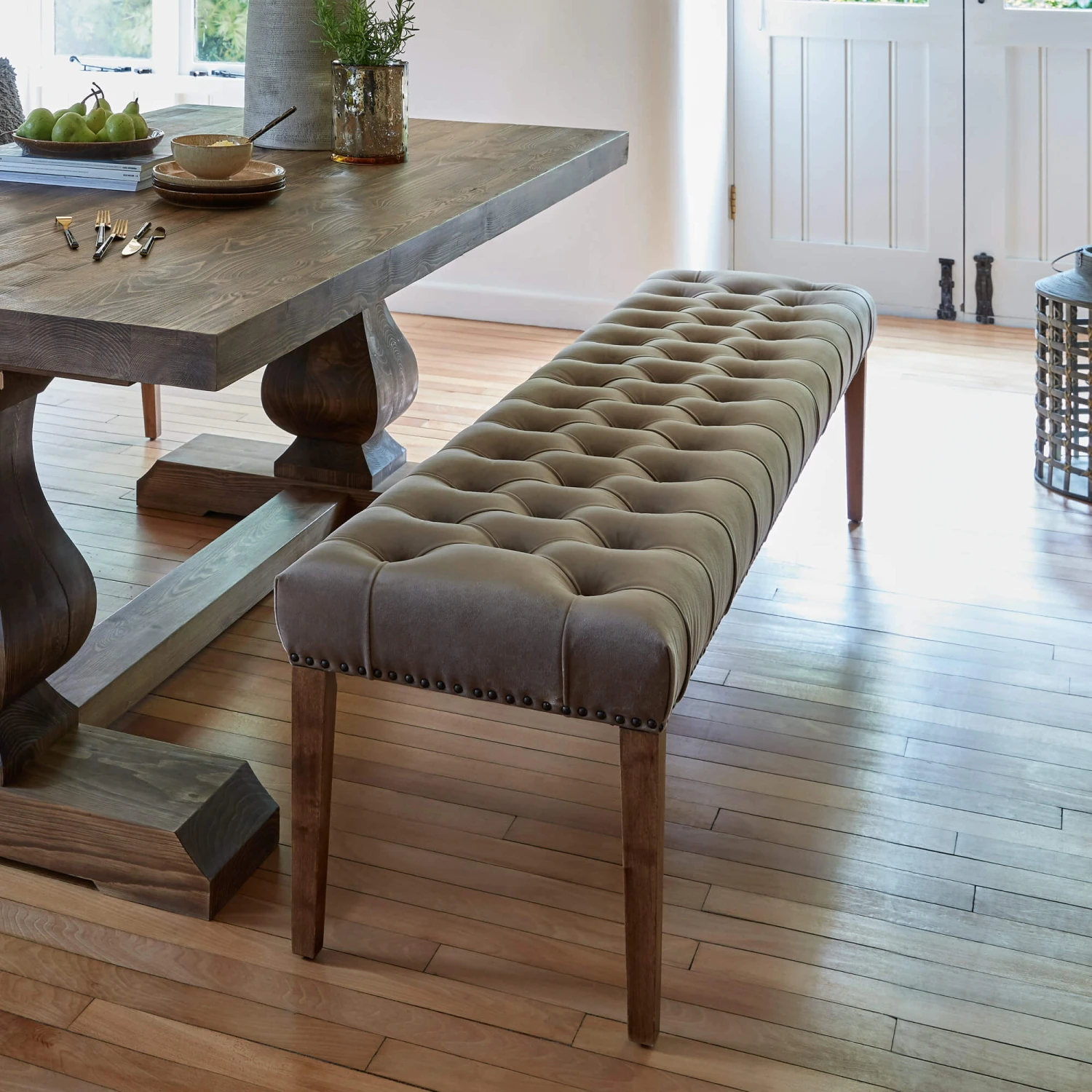 Alluring with its rustic charm, the Jacob 200cm Taupe Velvet Straight Dining Bench is sure to bring the idyllic essence of country living to any dining area. Boasting a beautiful taupe velvet upholstery with classic value tufting gracing the seat and a studded trim for accent detailing, the Jacob is the epitome of country chic with its elegant design and endearing features. Accompanied with its wooden legs in a neutral brown wash finish, the Jacob Dining Bench has an attractive, rustic-infused aesthetic which is bound to enhance any home décor.
