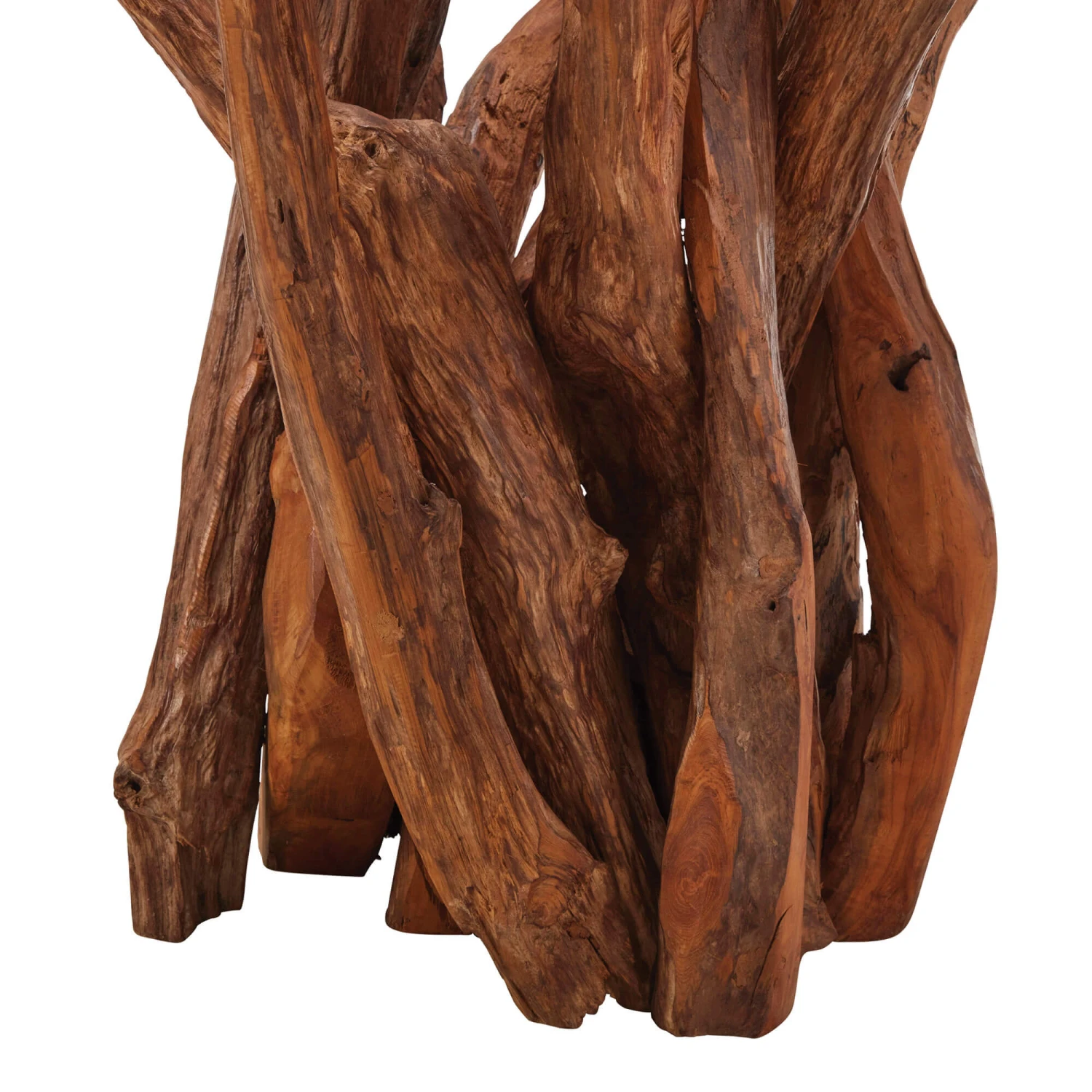 Beautifully crafted, this 130cm dining table has a round clear glass top and a base made from sustainably sourced reclaimed teak root wood; providing a unique and striking focal feature for your dining area. The table combines the beauty of natural wood with contrasting clear glass, and the fusion of modern design with a raw edge allows the table to complement a range of interiors.