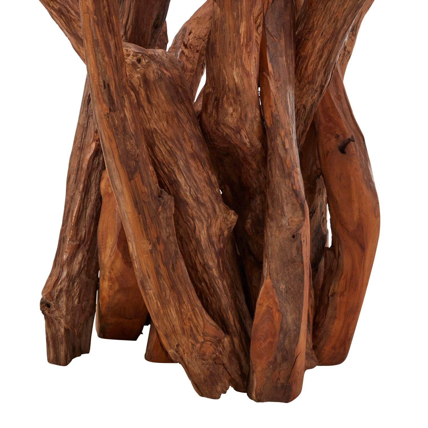 Beautifully crafted, this 130cm dining table has a round clear glass top and a base made from sustainably sourced reclaimed teak root wood; providing a unique and striking focal feature for your dining area. The table combines the beauty of natural wood with contrasting clear glass, and the fusion of modern design with a raw edge allows the table to complement a range of interiors.