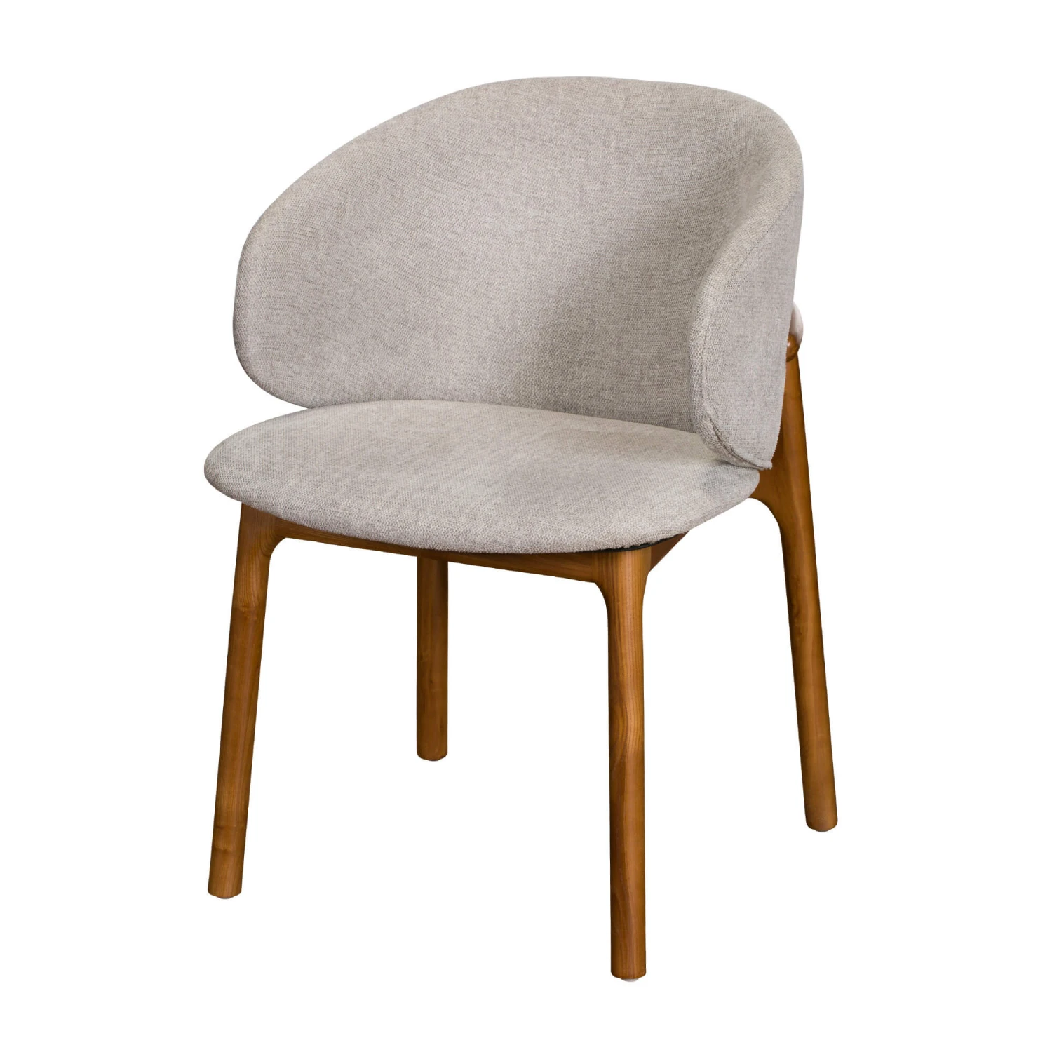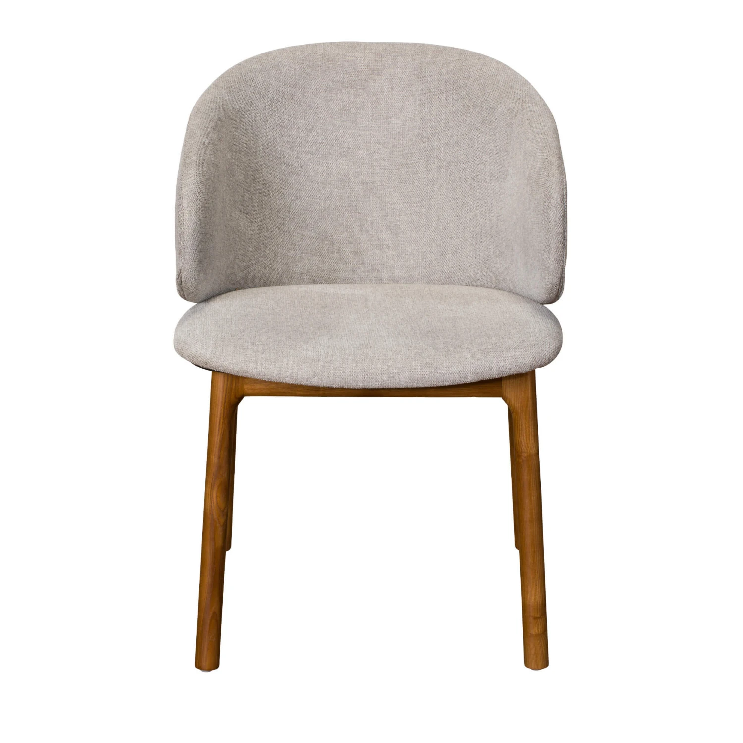 A dining chair with a curved back for comfort, upholstered in a light beige fabric with a padded seat. The solid ash legs and frame add a warm tone to your dining space and compliment a wide variety of dining table styles.