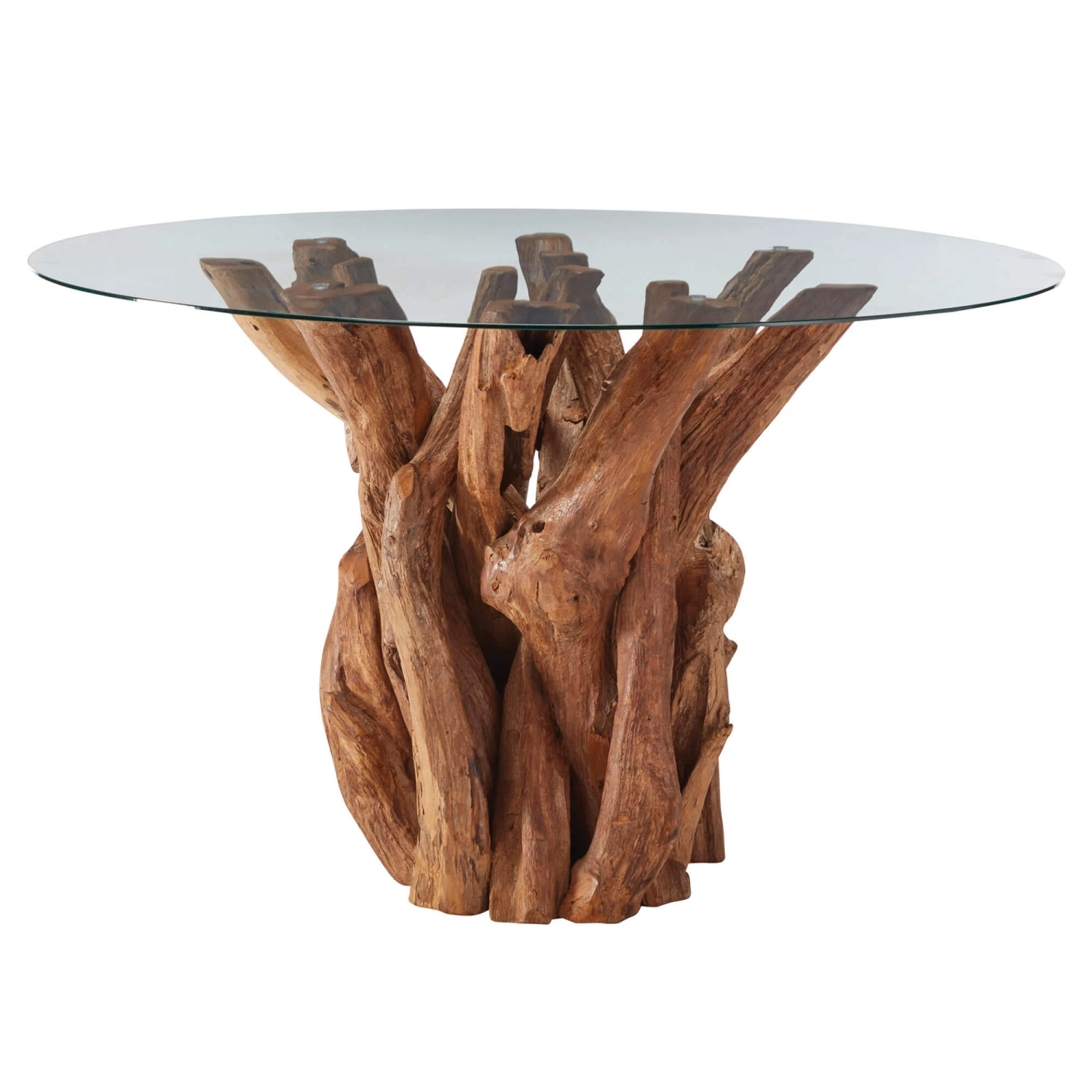 Beautifully crafted, this 130cm dining table has a round clear glass top and a base made from sustainably sourced reclaimed teak root wood; providing a unique and striking focal feature for your dining area. The table combines the beauty of natural wood with contrasting clear glass, and the fusion of modern design with a raw edge allows the table to complement a range of interiors.
