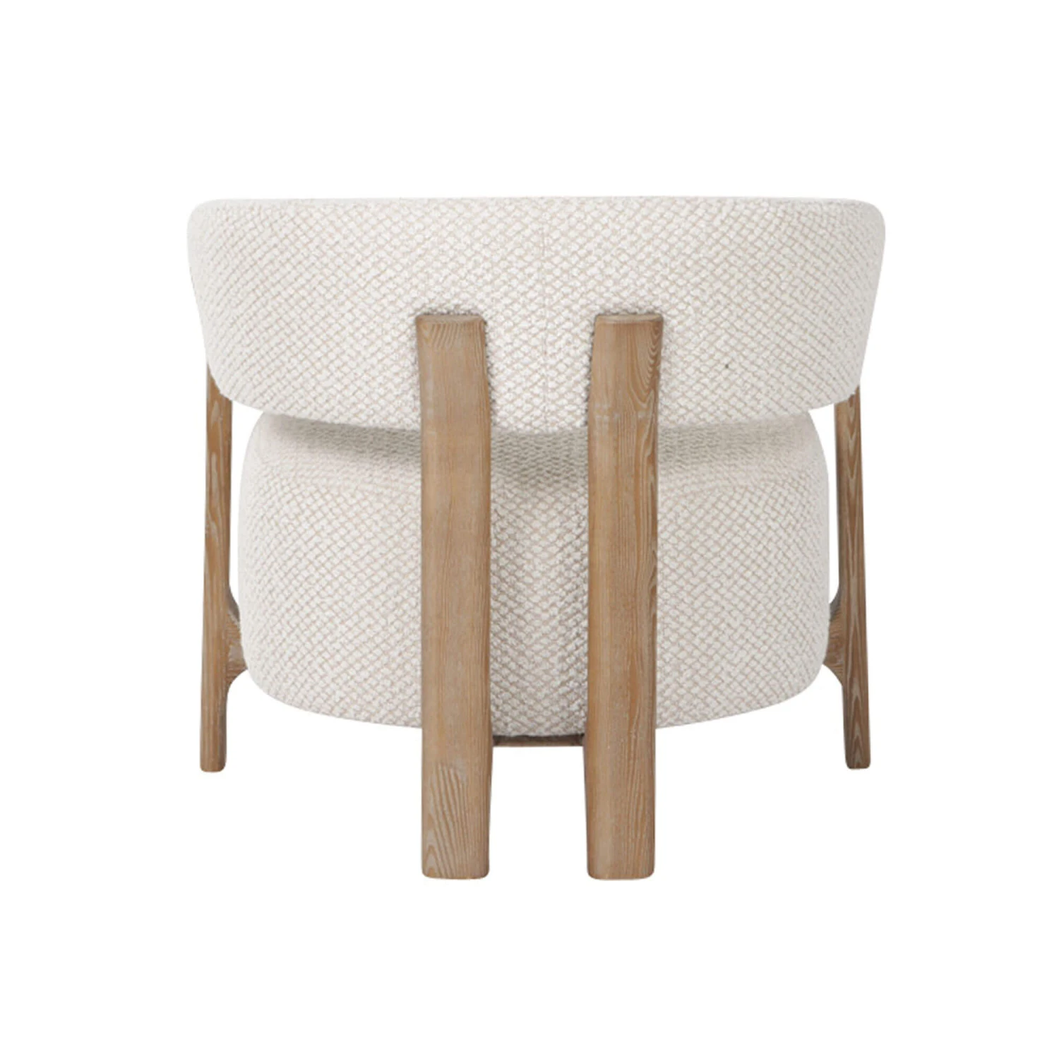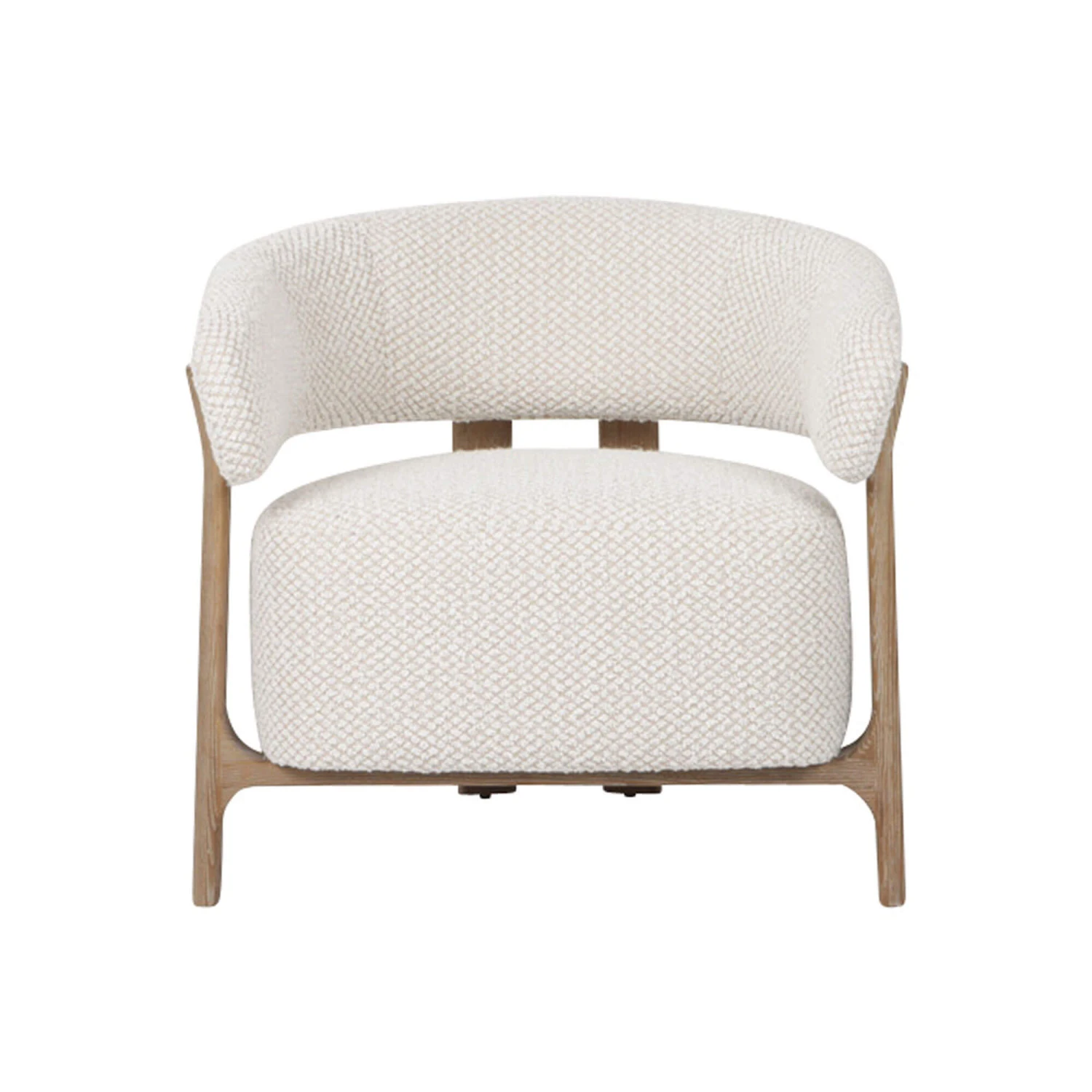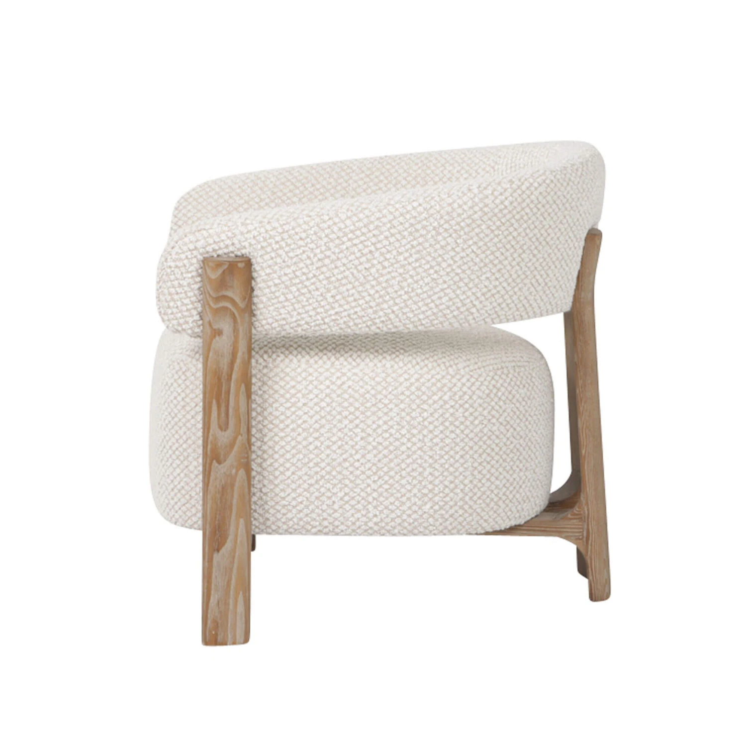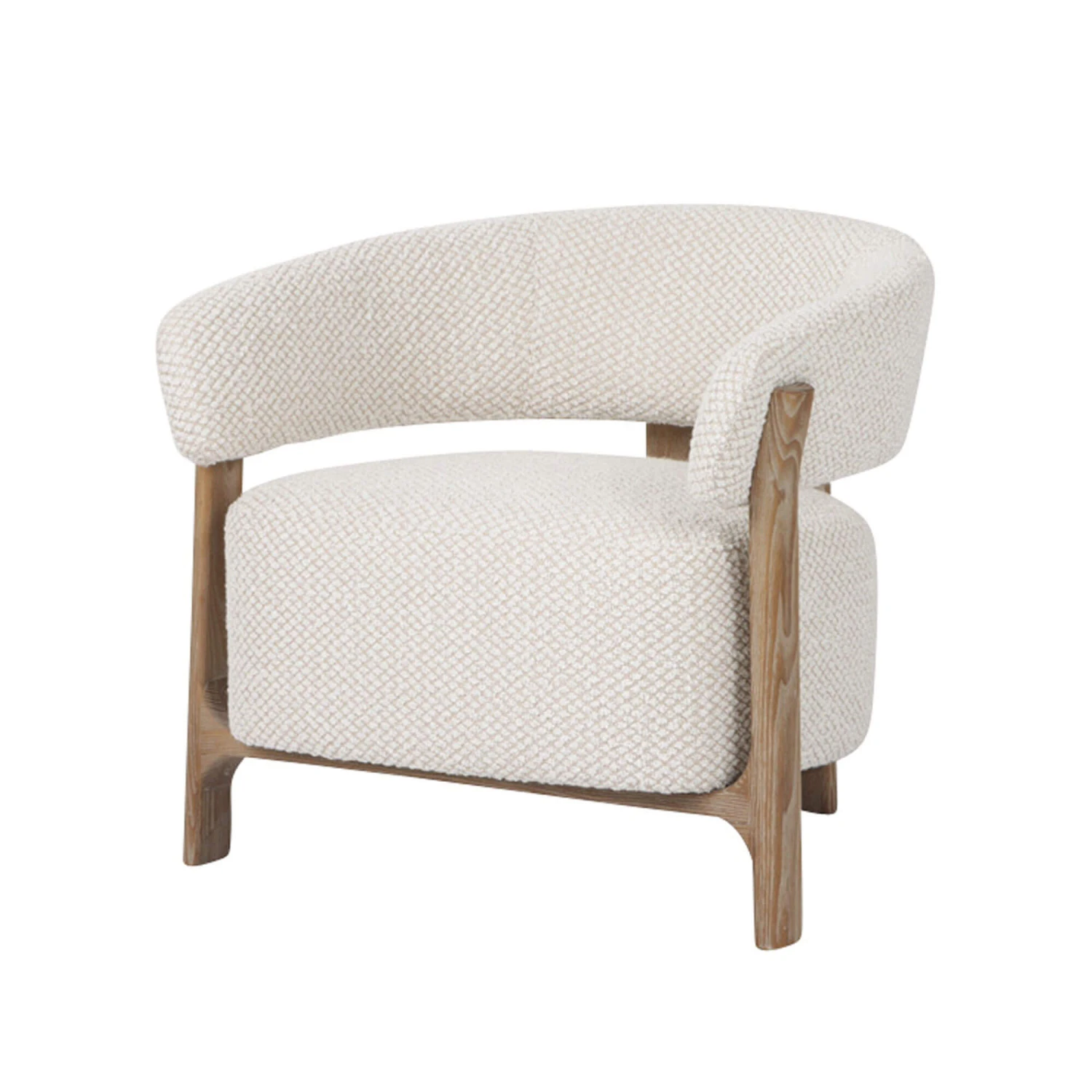 Cosy texture meets modern style with the Jesmond Cream Fabric Lounge Chair. Upholstered in a soft-textured cream fabric with a subtle pattern, the Jesmond features a gracefully curved backrest, a generously padded seat and a wooden frame, creating an inviting and elegantly sculpted piece able to offer exceptional comfort and stylish support. With an open back design, it has two central vertical wooden supports connected from the backrest to the seat, allowing it to add architectural interest and a sense of lightness to the chair.