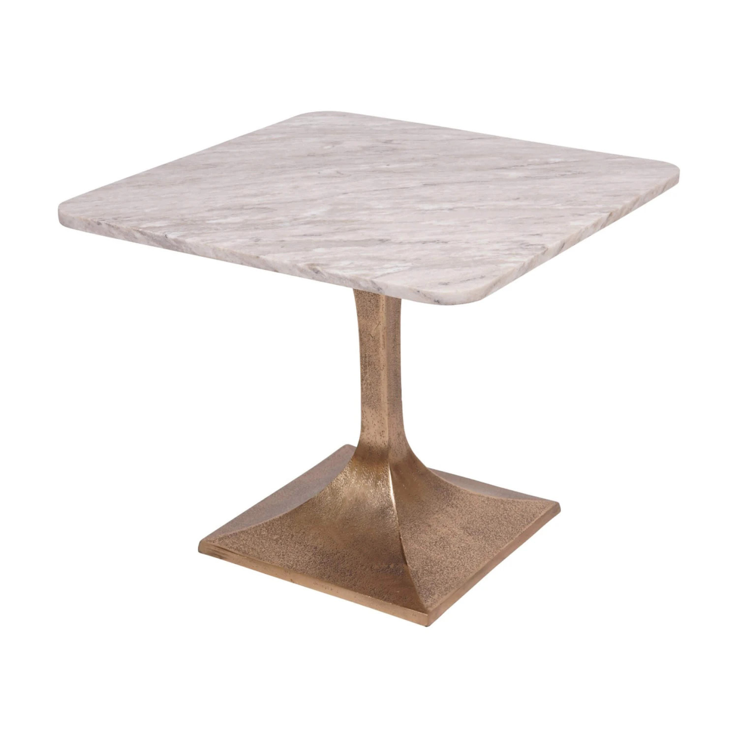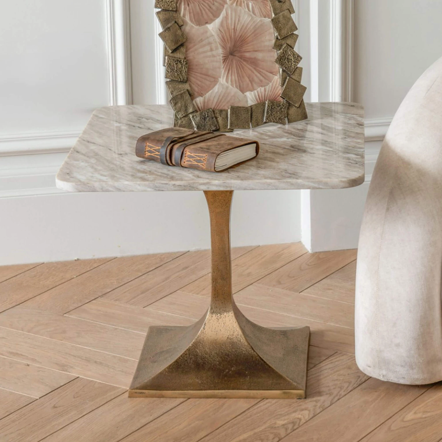 A contemporary 55cm square marble side table featuring an aluminium base with an antique brass effect finish that adds a rustic charm. The white marble top features natural veining that characterises the table. With soft rounded edges on the table top, it leans towards a sleek, contemporary feel.